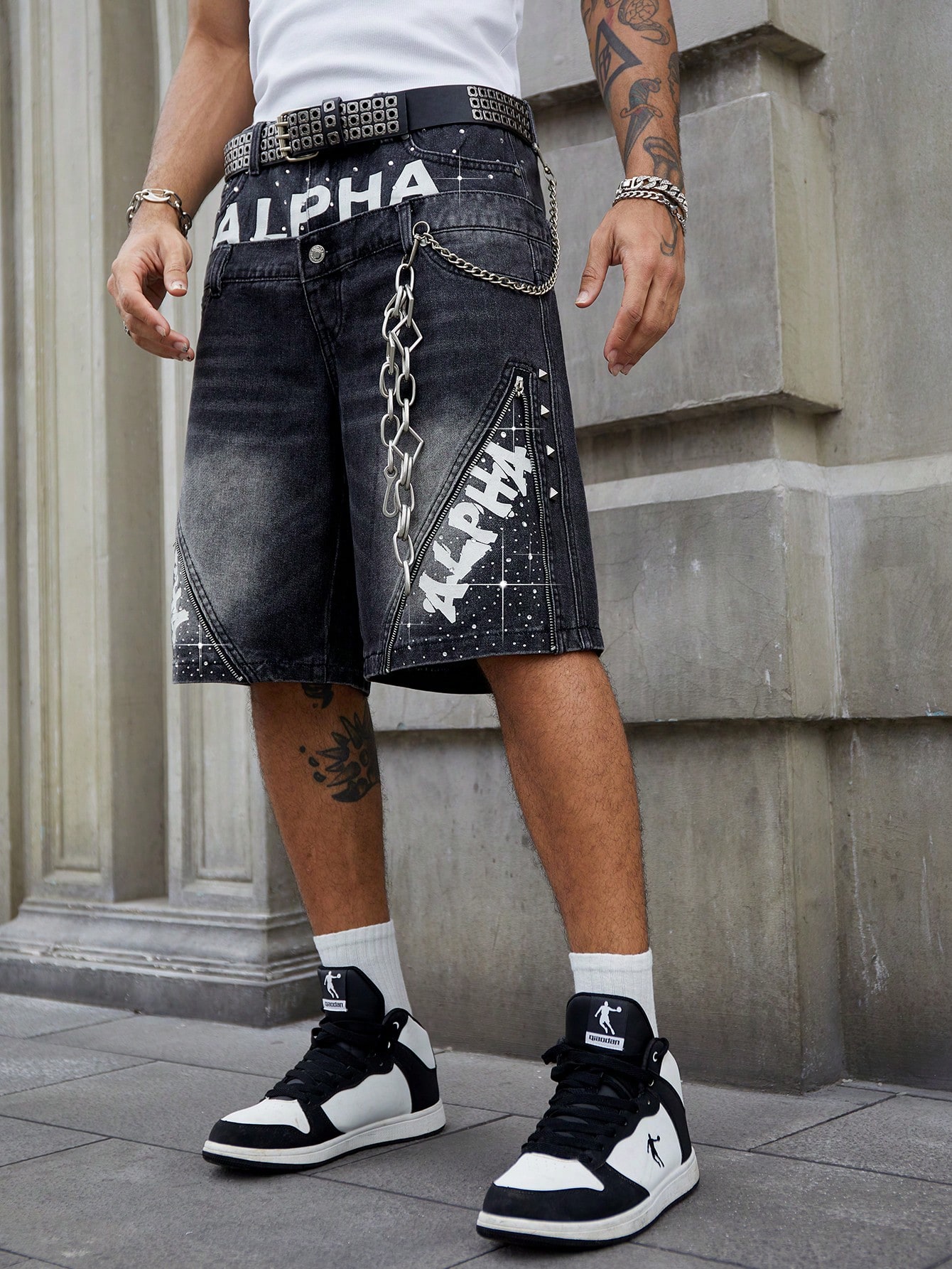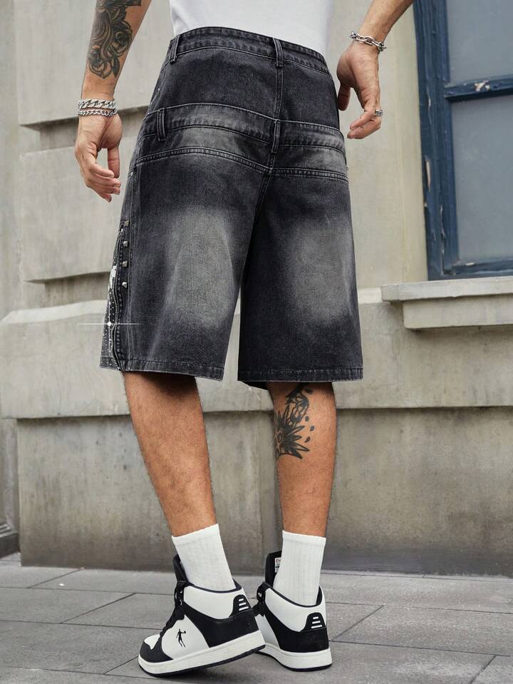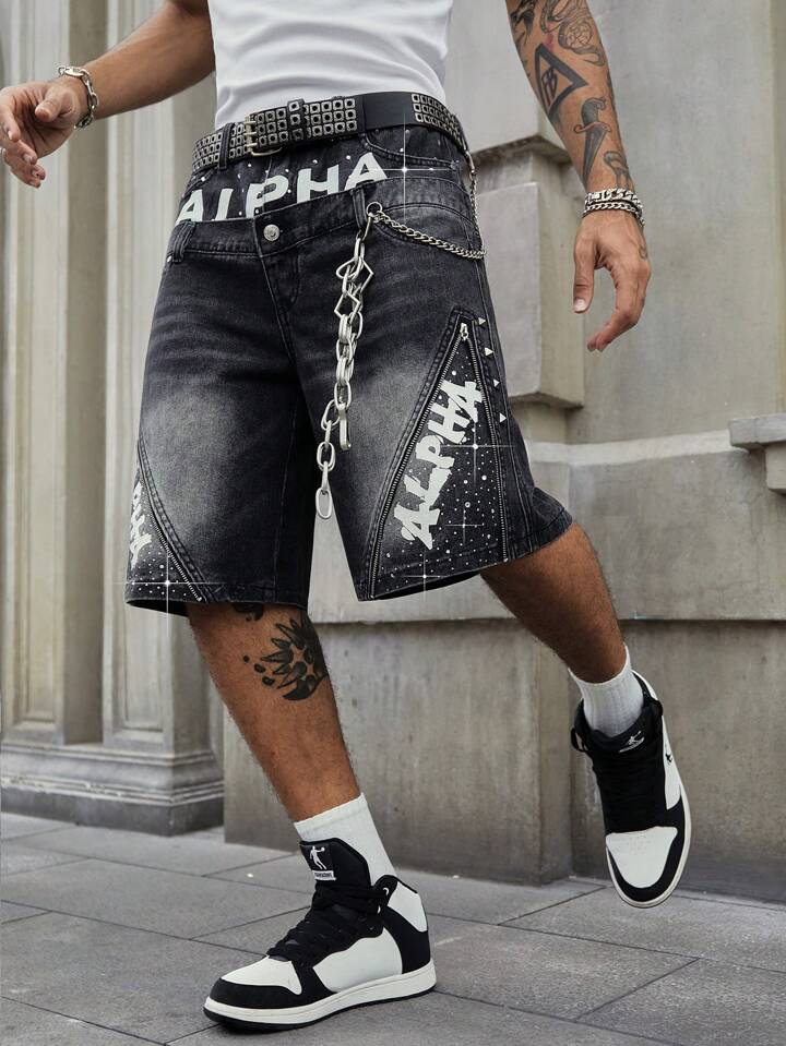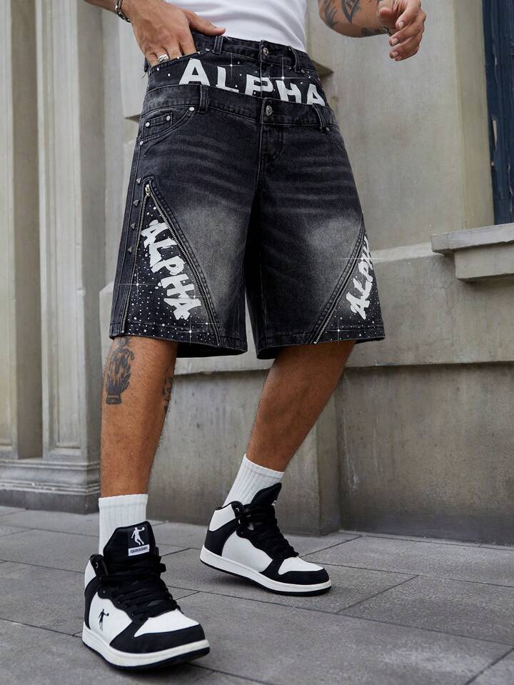 Men's Street Life Double-Layered Waistband Shiny Letter & Diamond Decor Denim Shorts