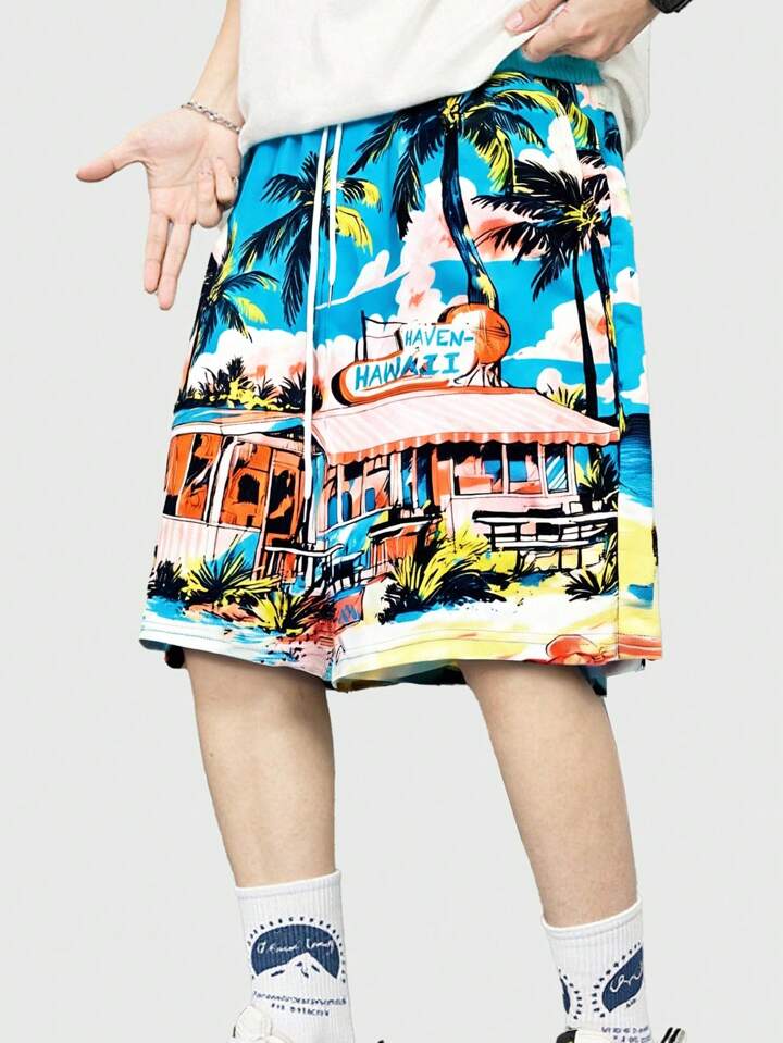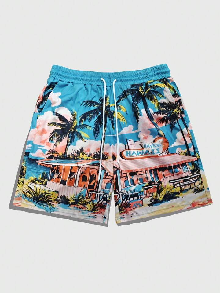 Men's Vacation Palm Tree Print Drawstring Waist Pocket Casual Shorts, Fashionable Brand