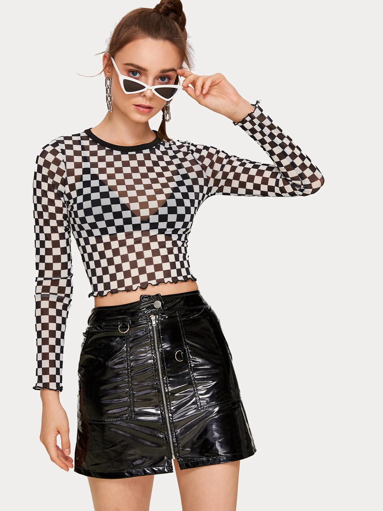 Mesh Check Plaid Lettuce Trim Sheer Tee Without Bra