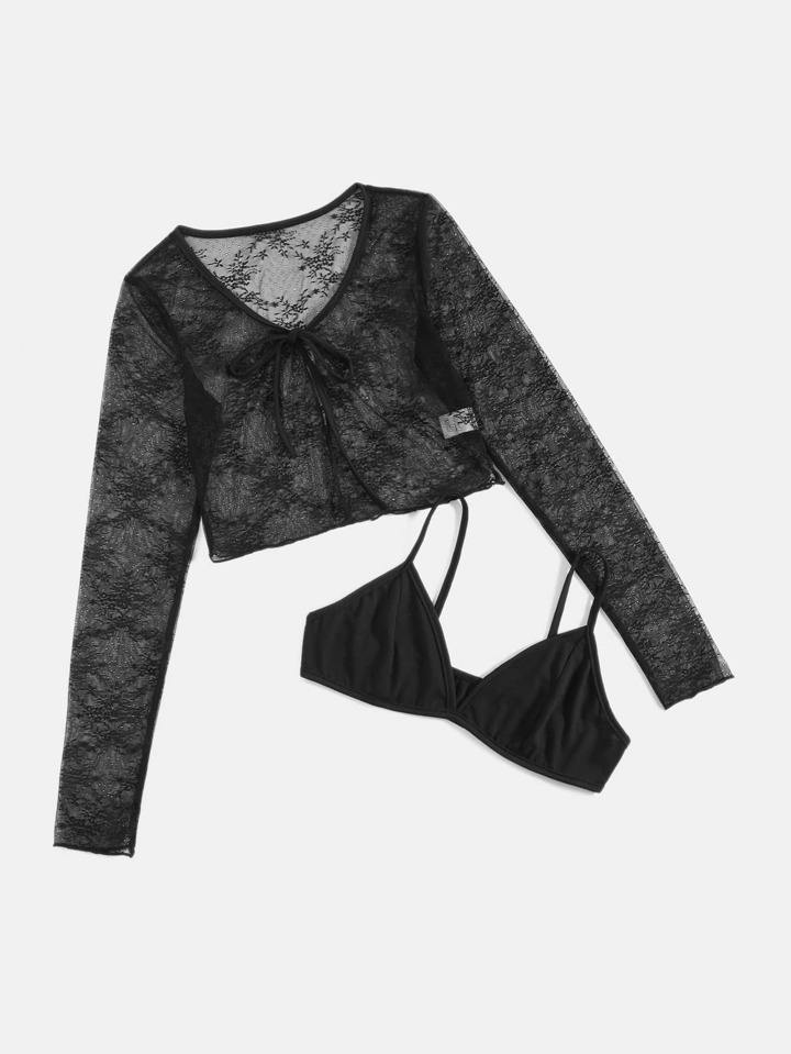 Mesh Tie Front Crop Top & Solid Crop Cami