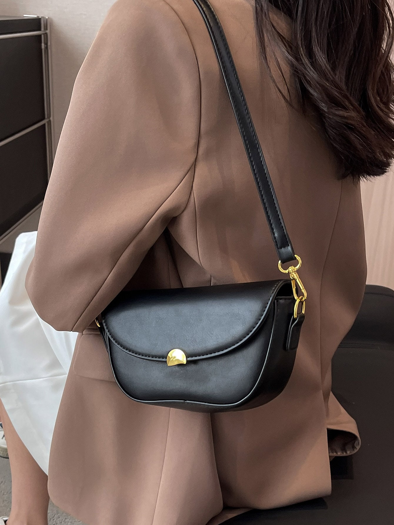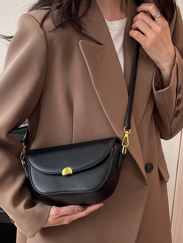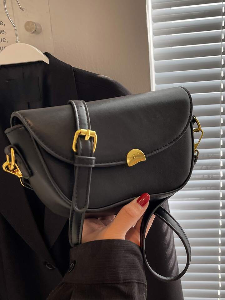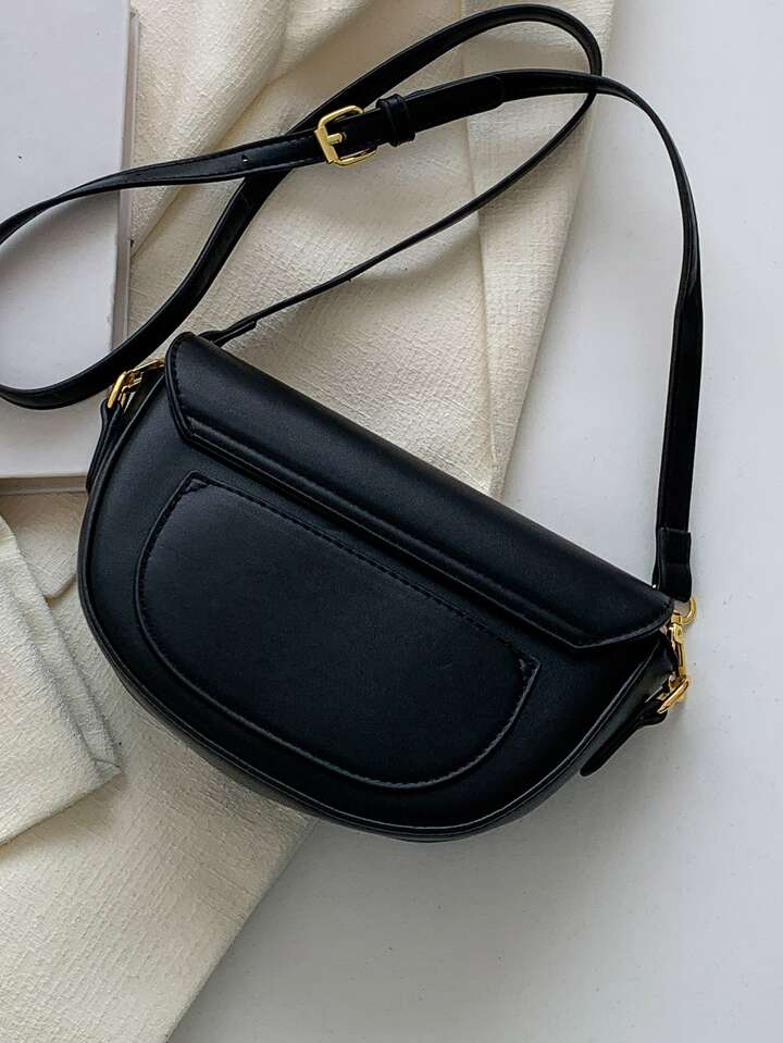 Minimalist Saddle Bag Metal Decor Flap Black For Daily