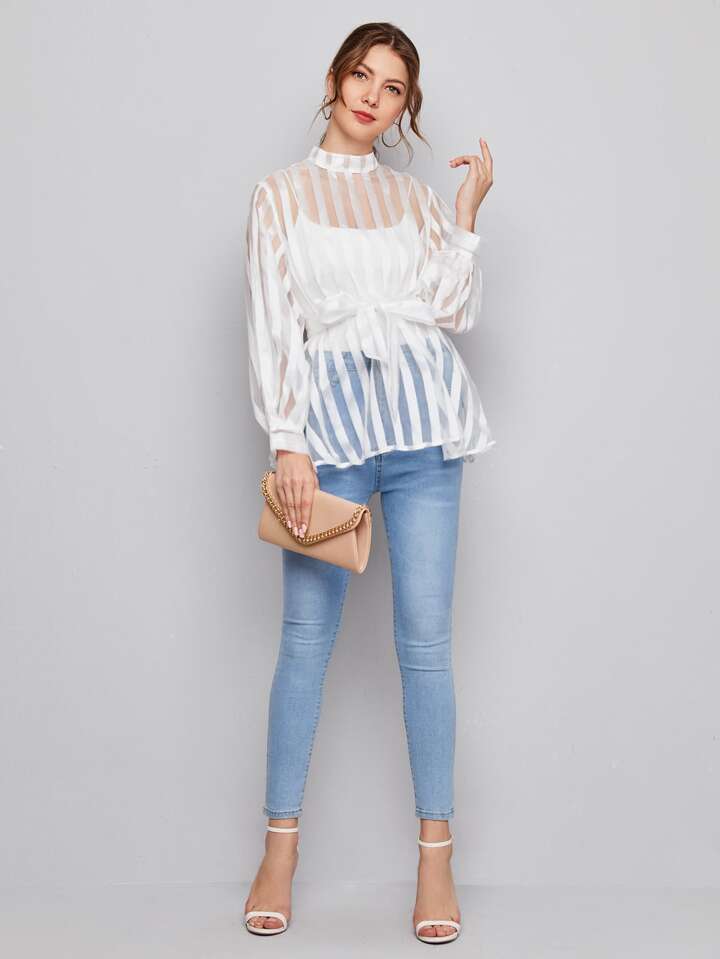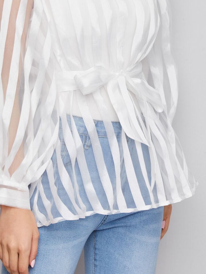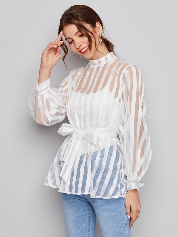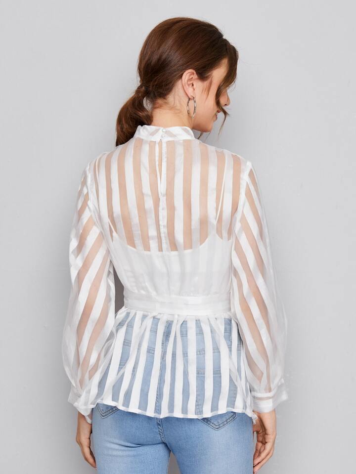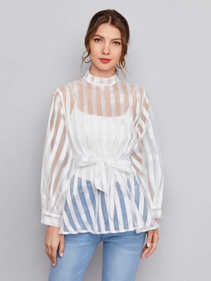 Mock Neck Belted Striped Sheer Organza Top Without Camisole