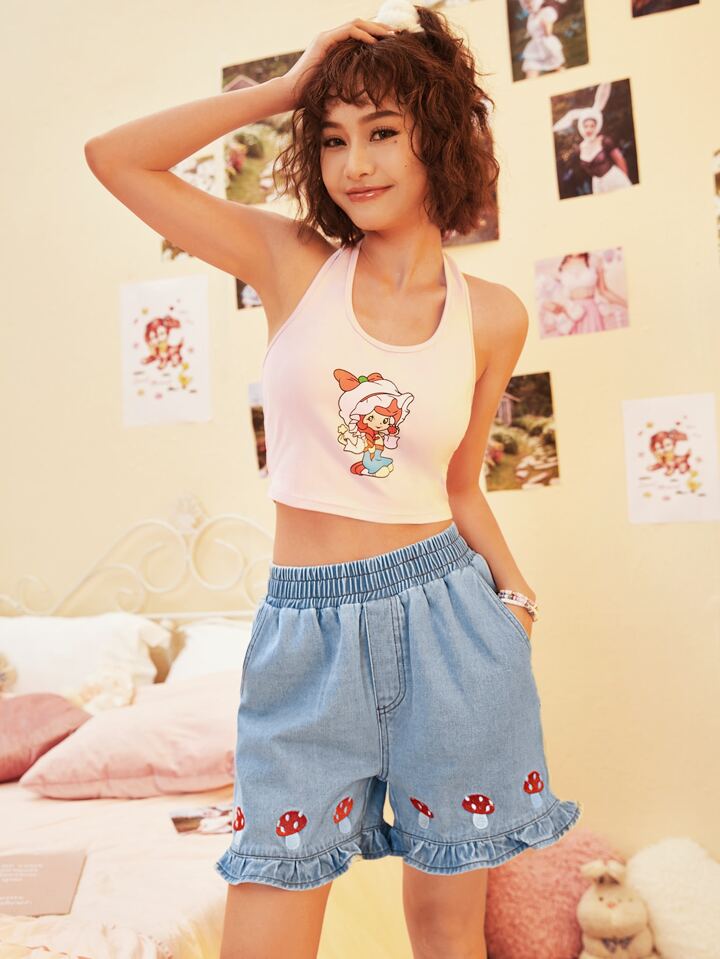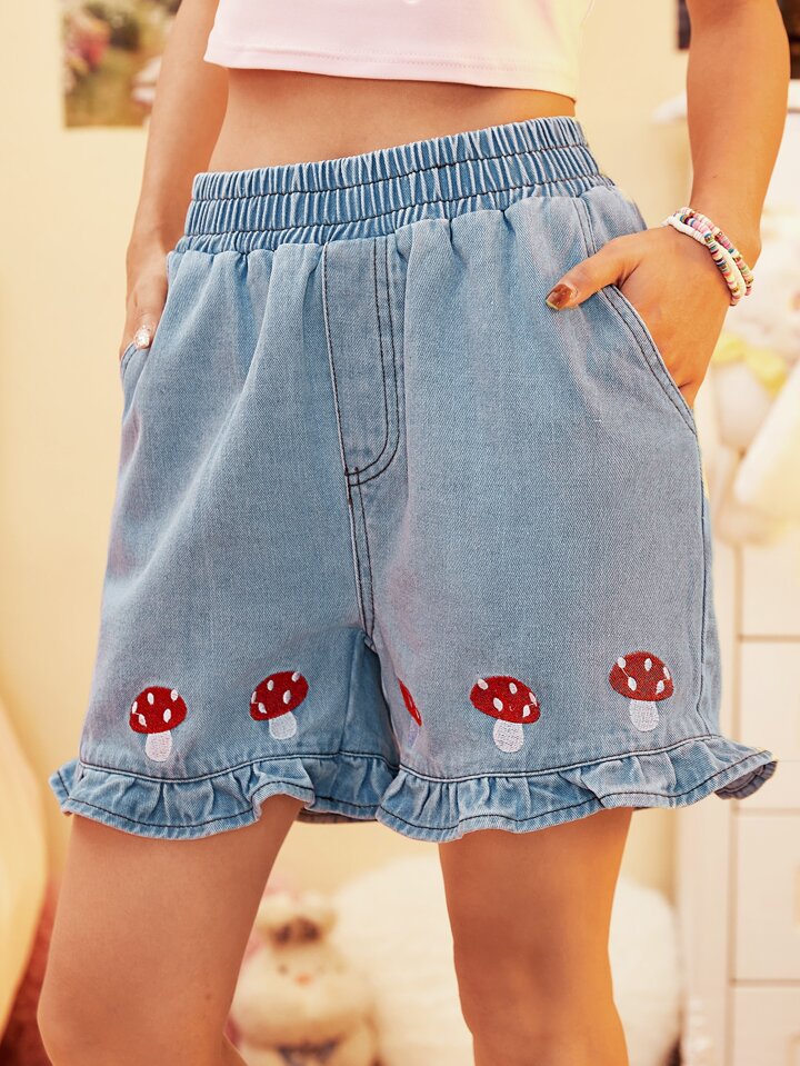 Mushroom Embroidery Ruffle Hem Denim Shorts
