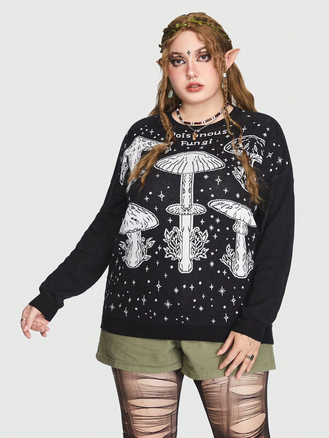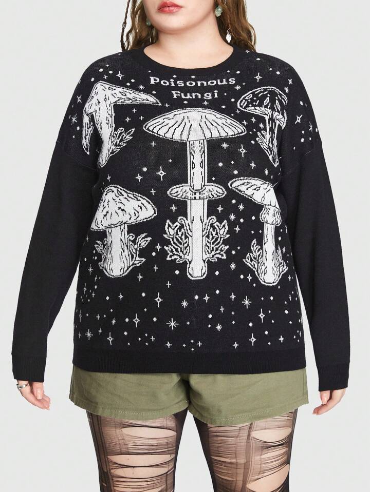 Mystic heart Fairycore Plus Mushroom Pattern Drop Shoulder Sweater