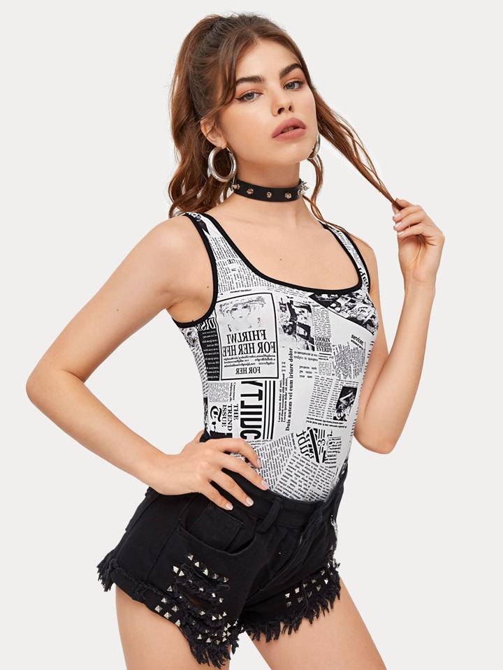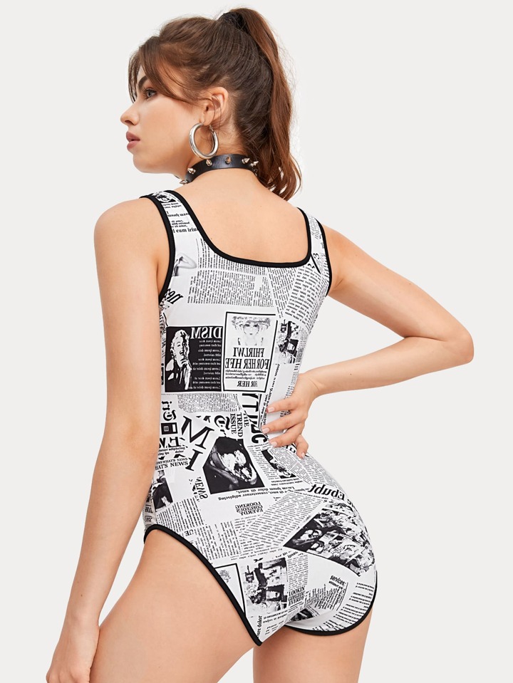 Newspaper Print Contrast Binding Tank Bodysuit
