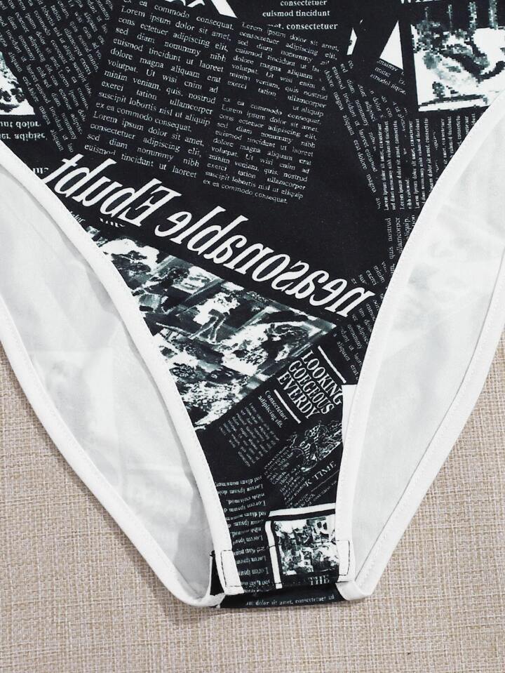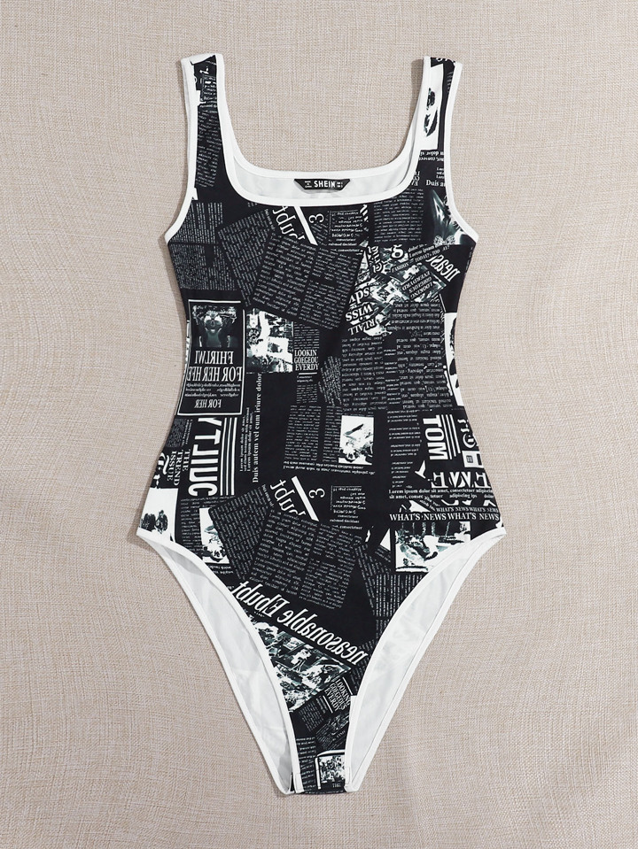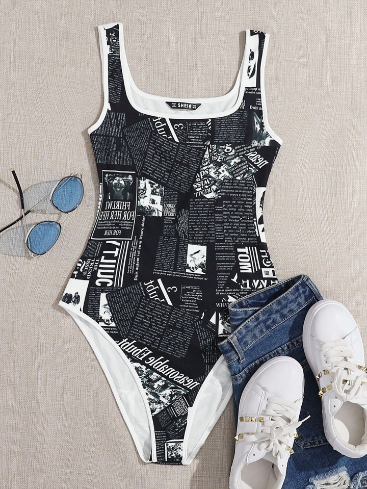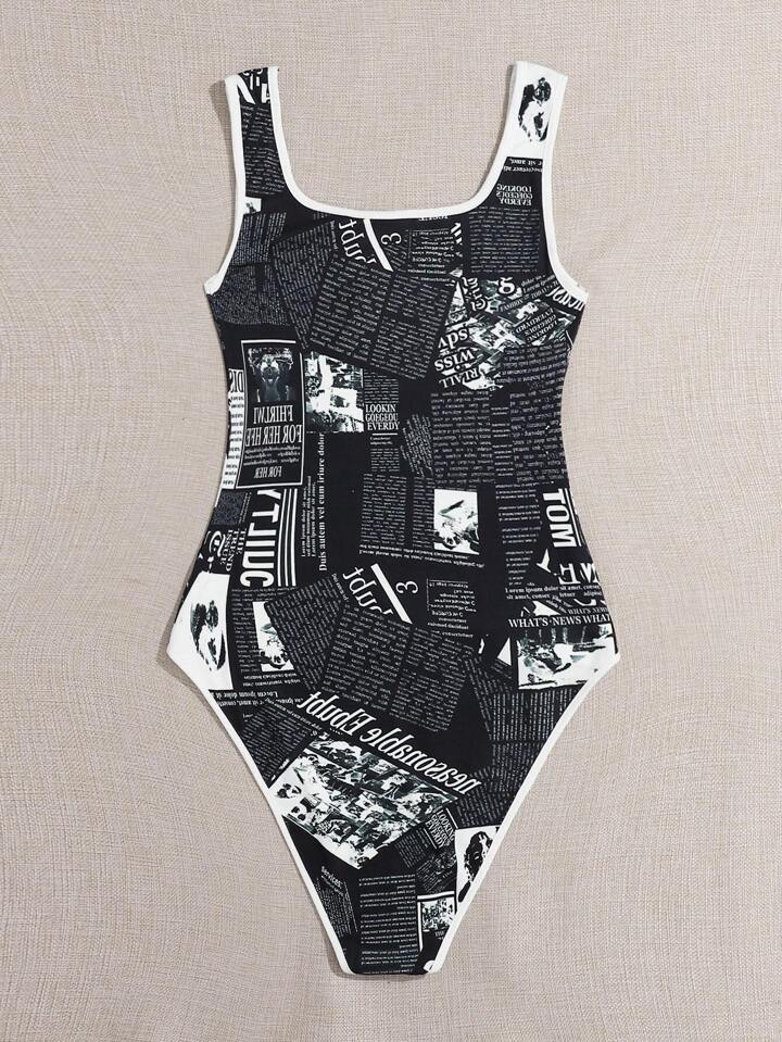 Newspaper Print Contrast Binding Tank Bodysuit