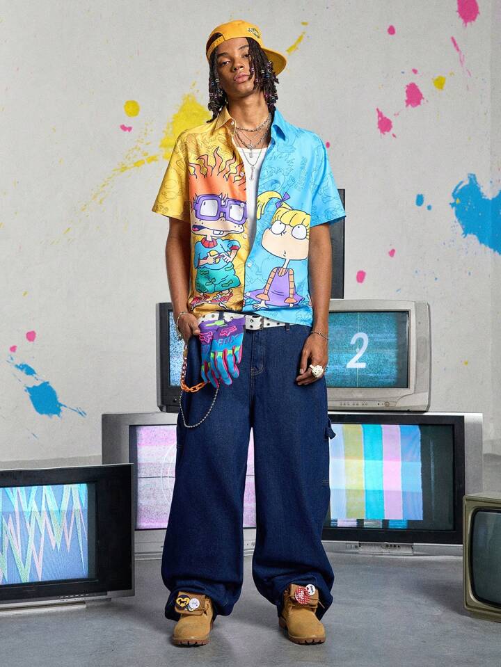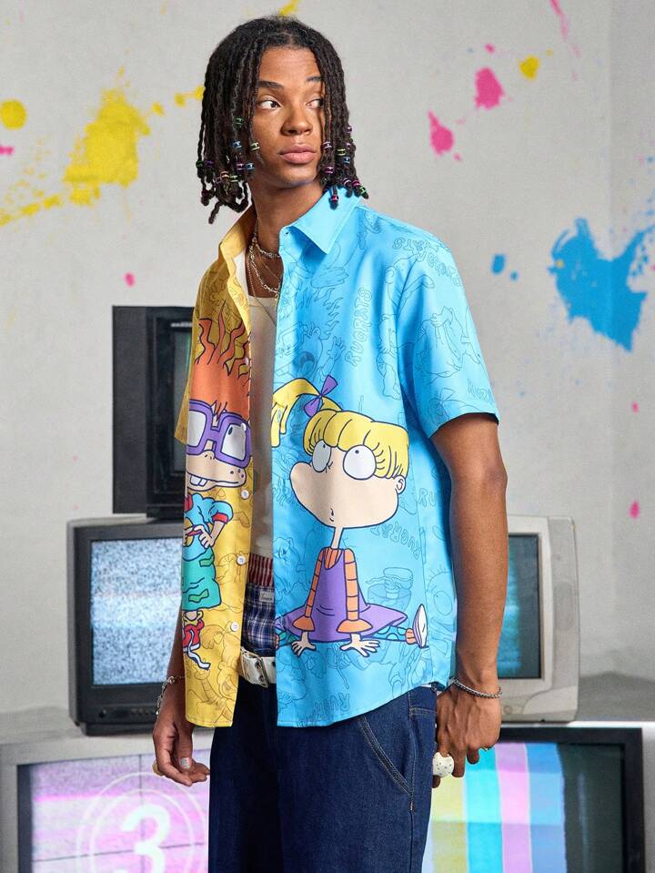 Nick 90's X ROMWE Street Life Men Fashion Summer Casual Sports Cartoon Graphic Colorblock Shirt