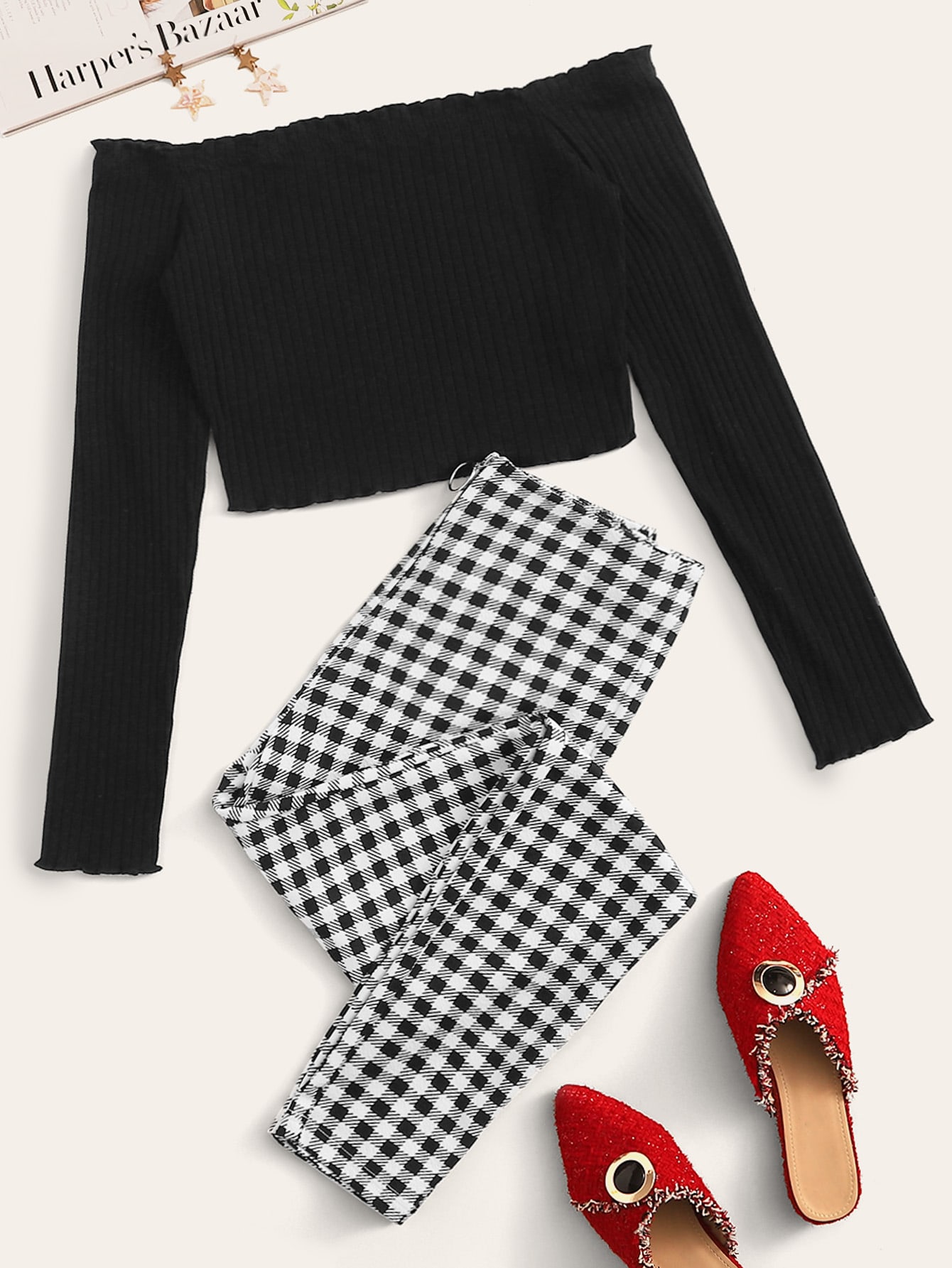 Off Shoulder Lettuce Edge Tee and Gingham Skinny Pants Set