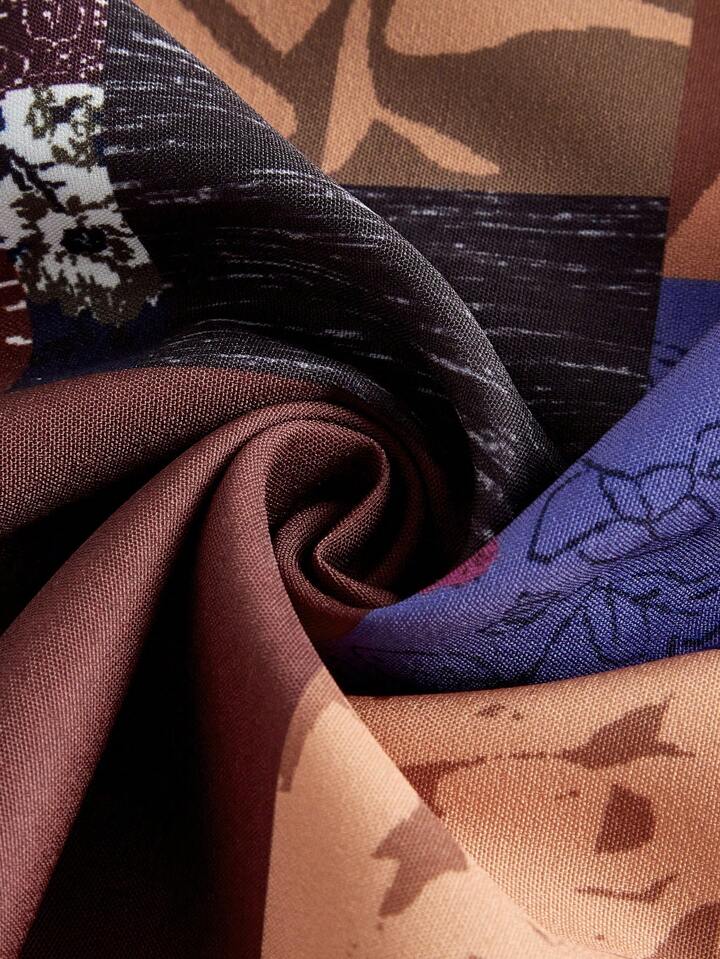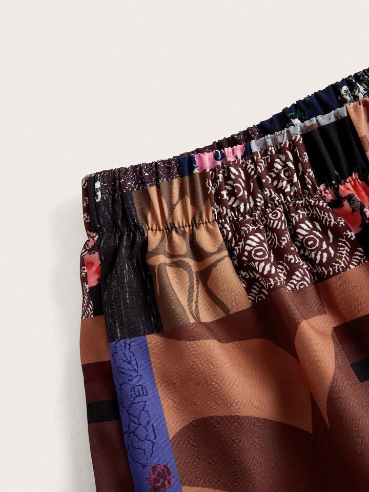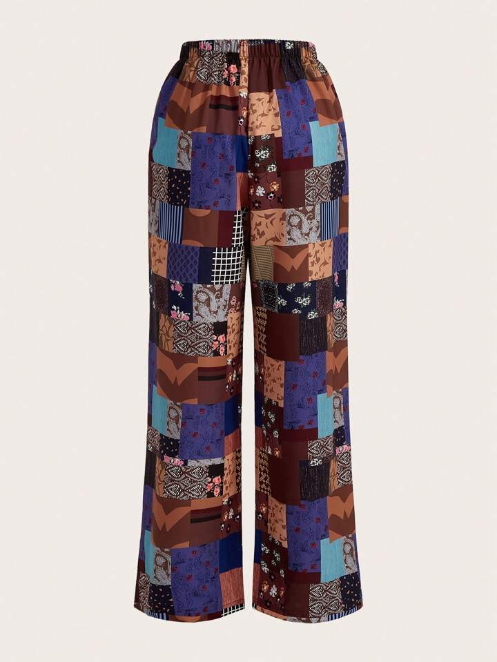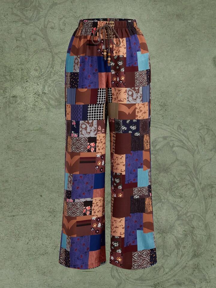 Patchwork Print Drawstring Waist Wide Leg Pants
