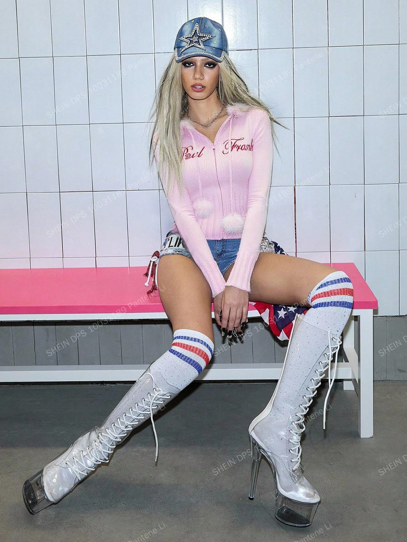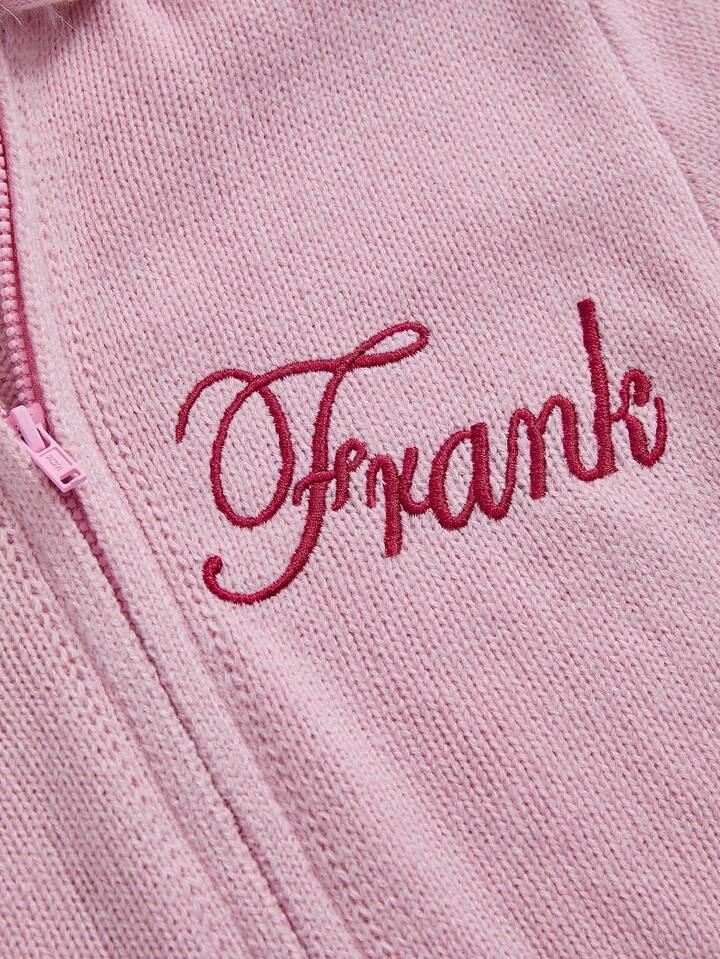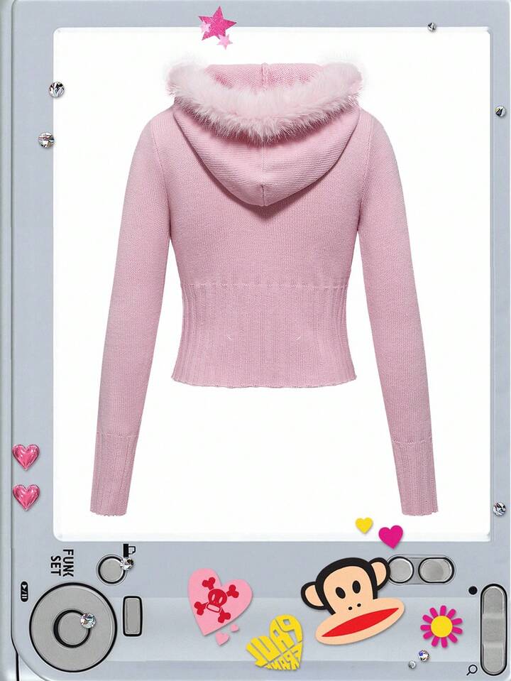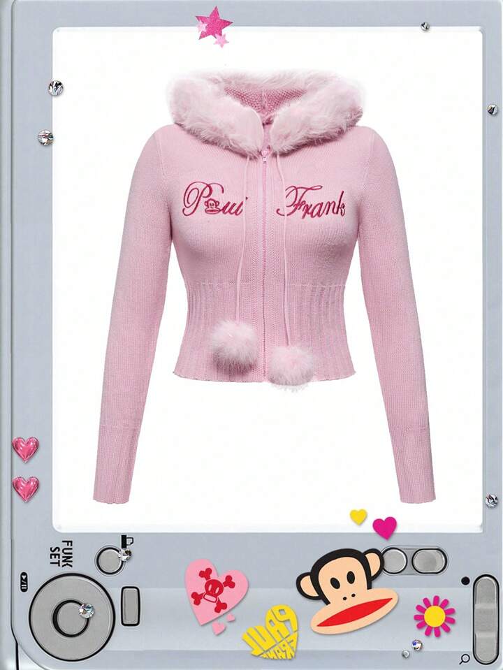 Paul Frank X ROMWE Women's Embroidered Pink Hooded Cardigan With Pom Pom