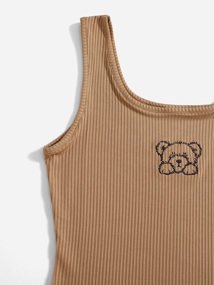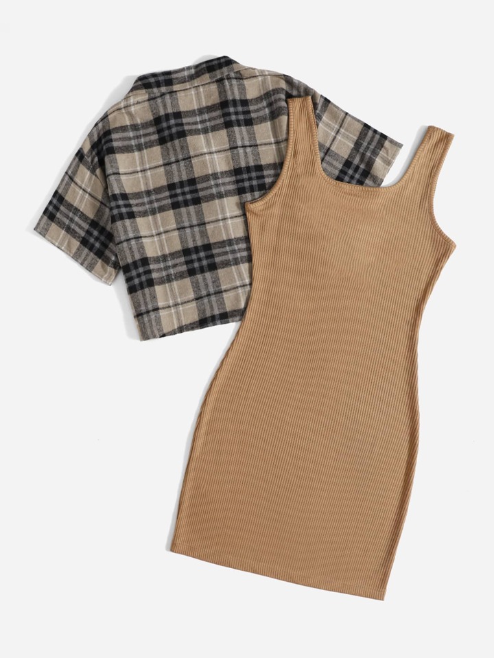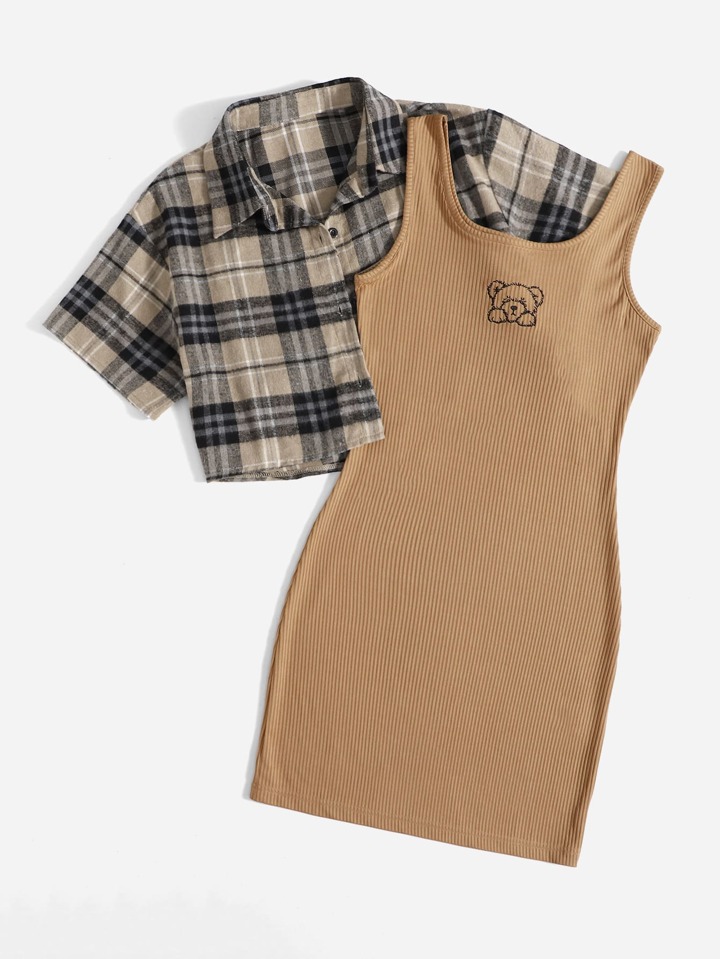 Plaid Button Front Blouse & Cartoon Bear Embroidery Ribbed Dress