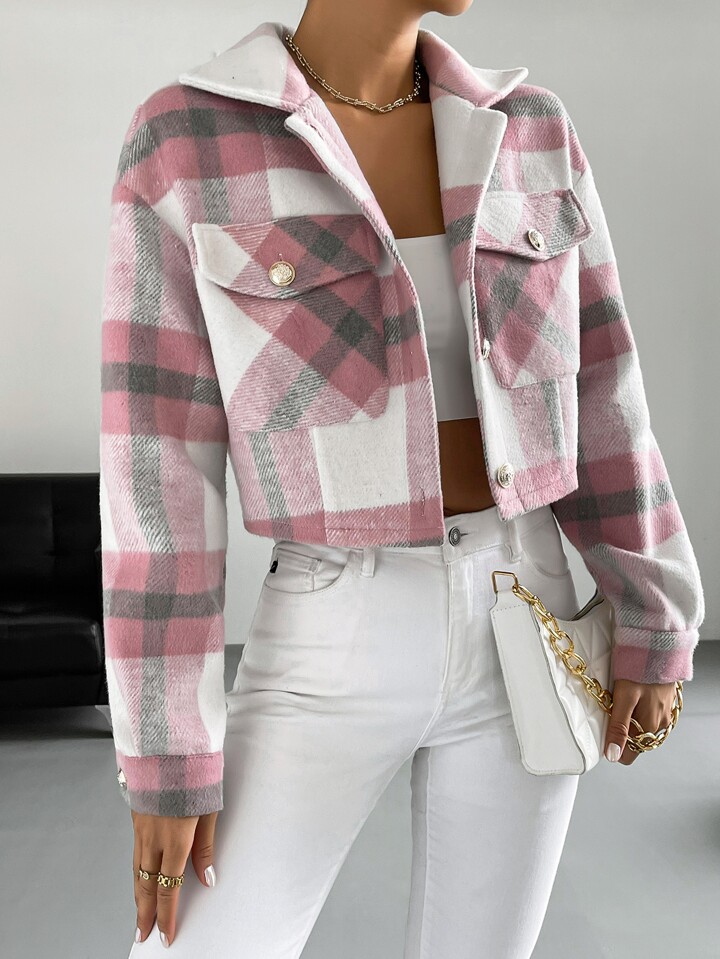 Plaid Flap Pocket Drop Shoulder Crop Overcoat