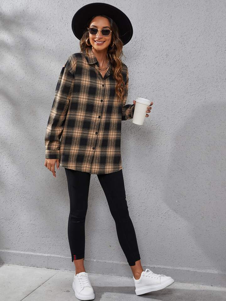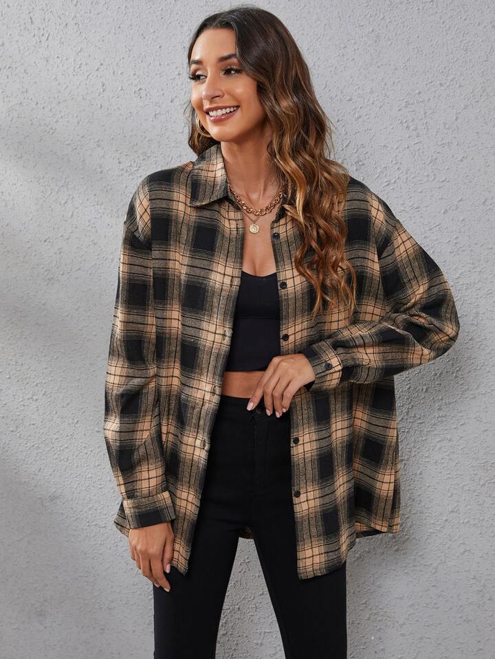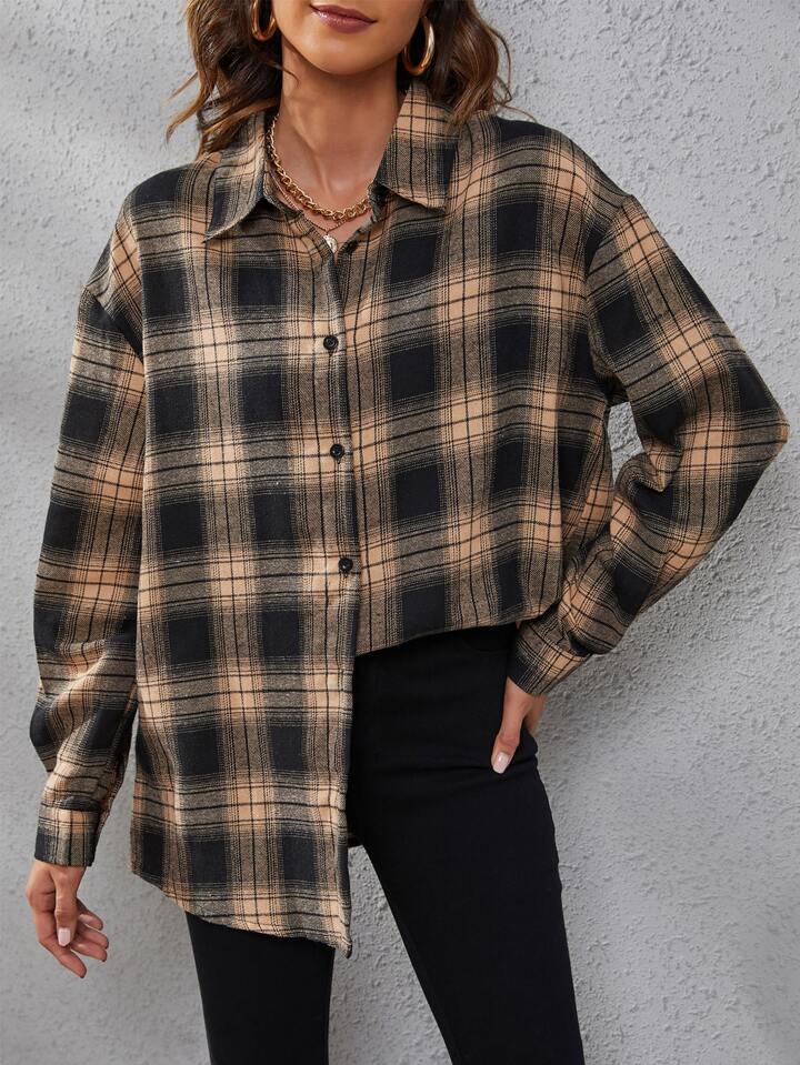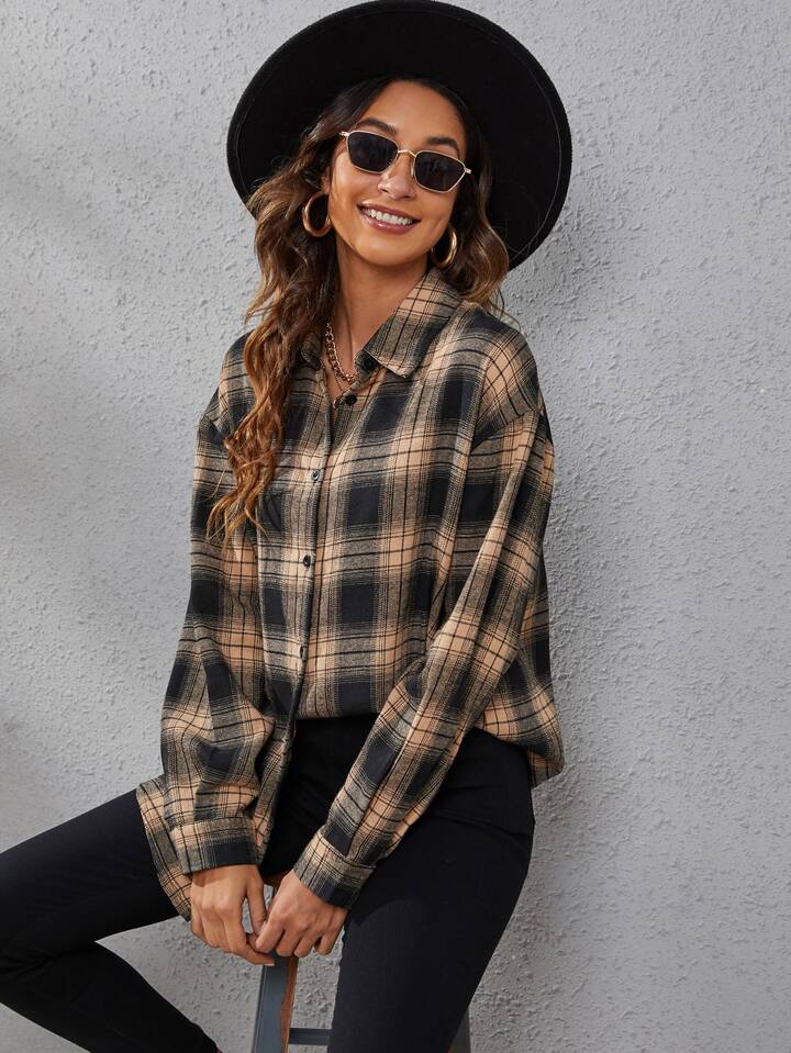 Plaid Print Drop Shoulder Shirt,Long Sleeve Tops Fall Cloth For Women
