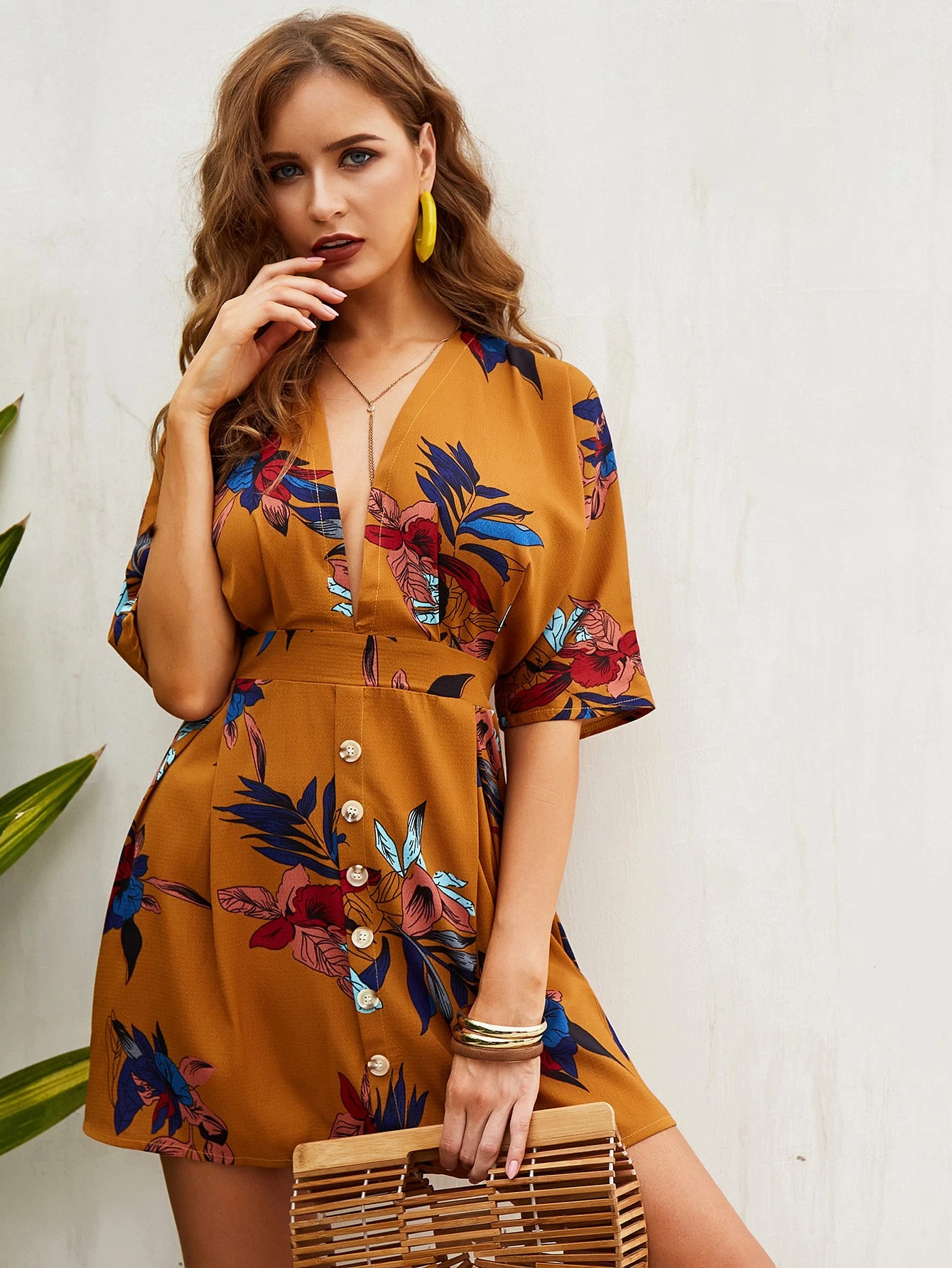 Plunging Neck Tie Back Floral Print Dress