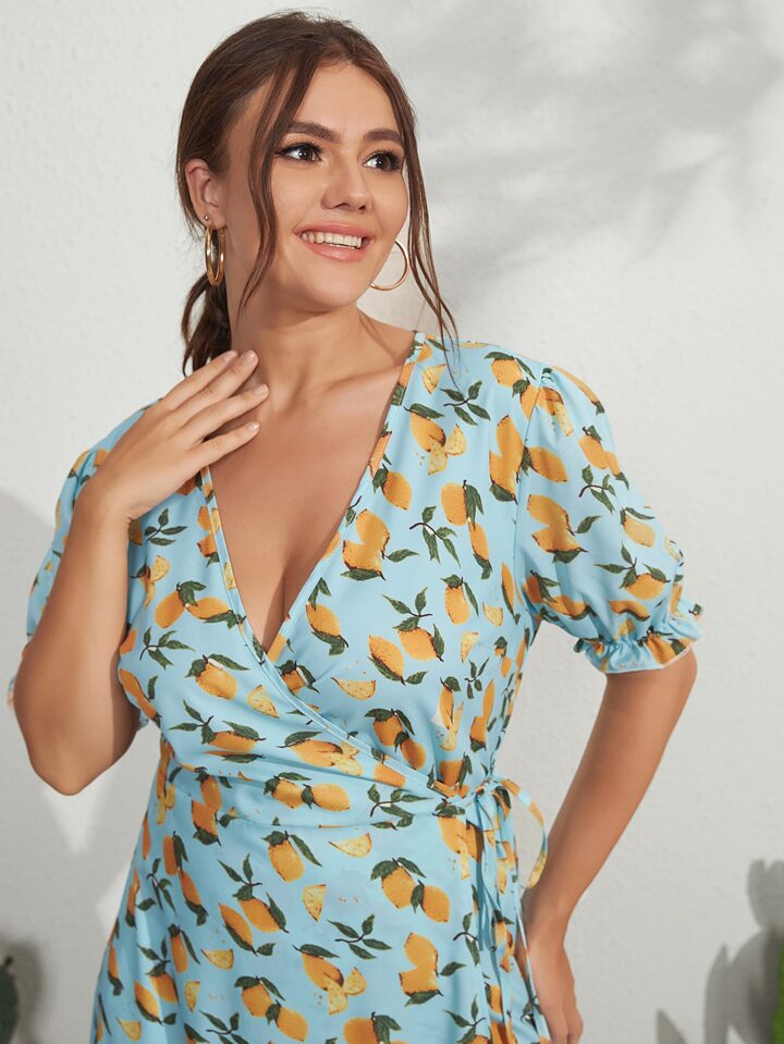 Plus Allover Lemon Print Tie Side Wrap Dress