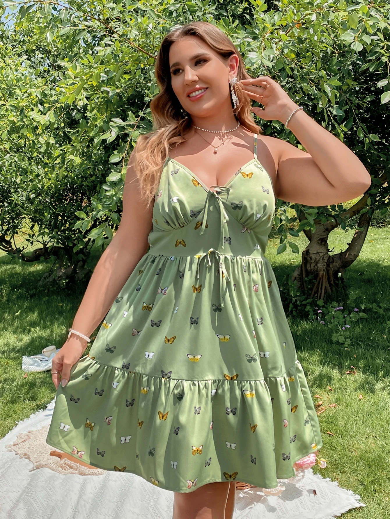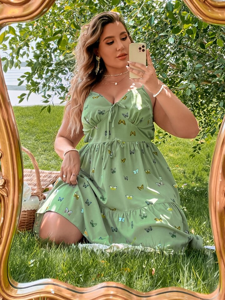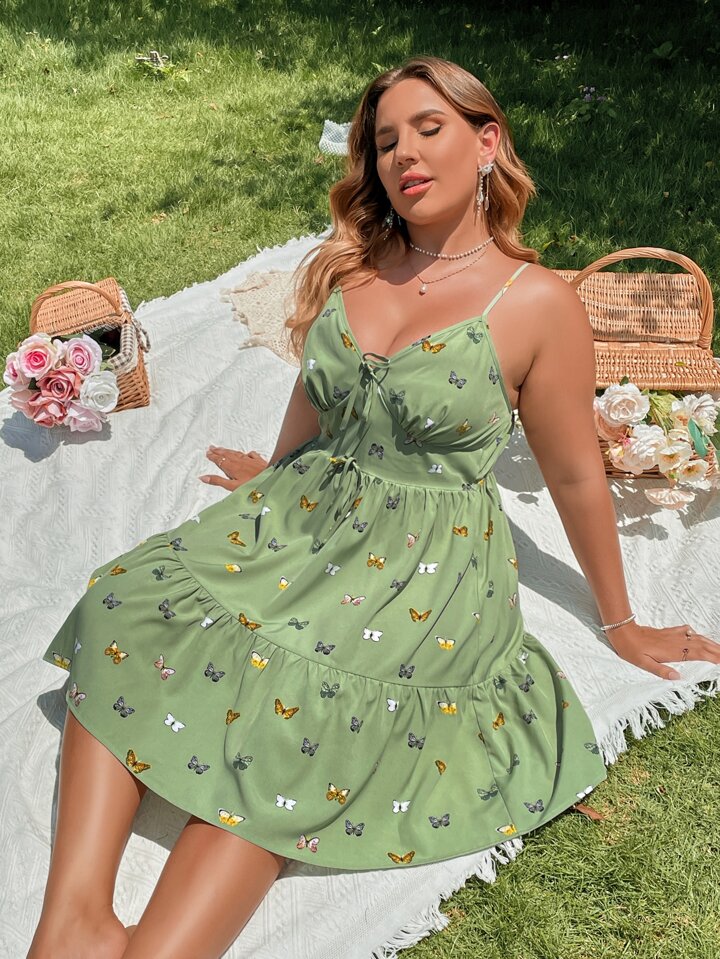 Plus Butterfly Print Tie Front Ruffle Hem Cami Dress
