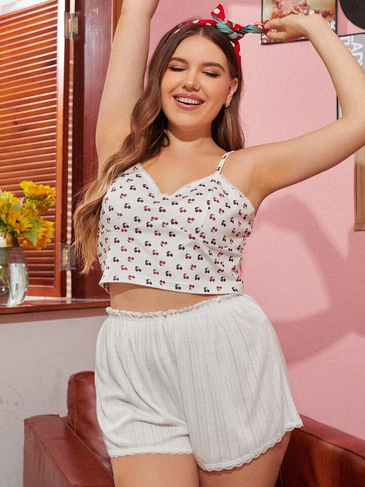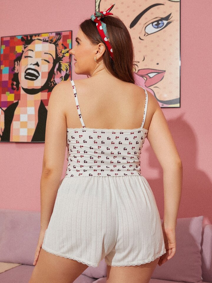 Plus Cherry Print Lace Insert Pajama Set