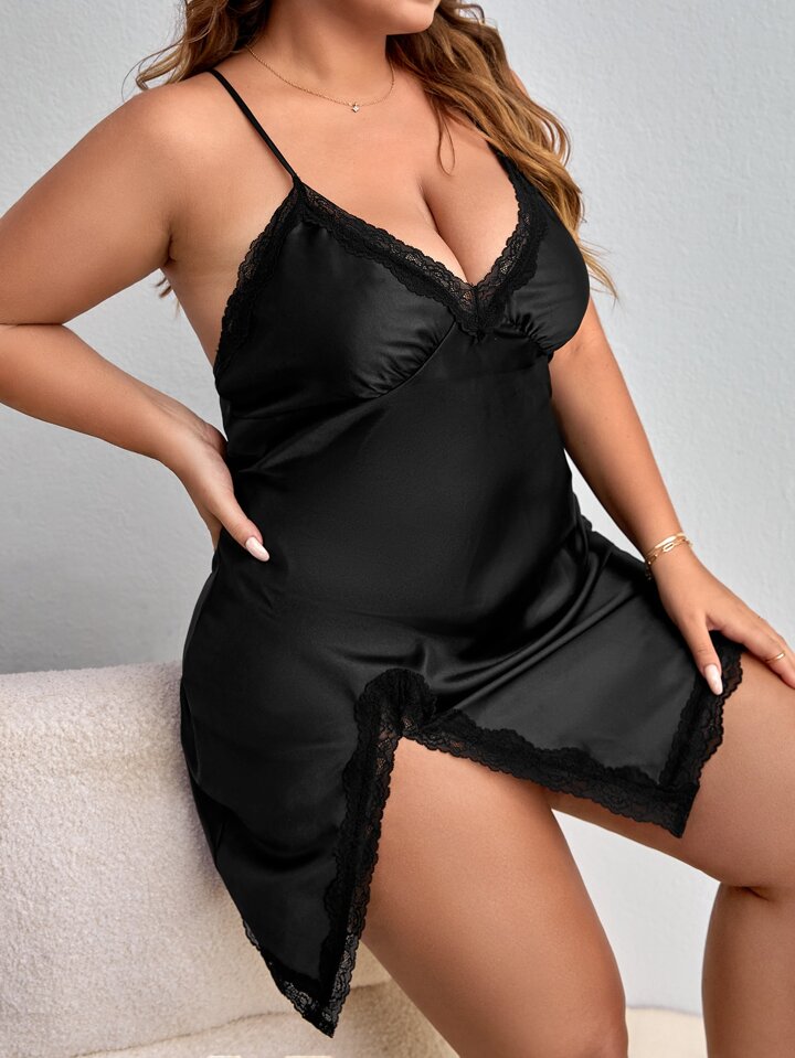 Plus Contrast Lace Crisscross Backless Slit Hem Satin Cami Nightdress