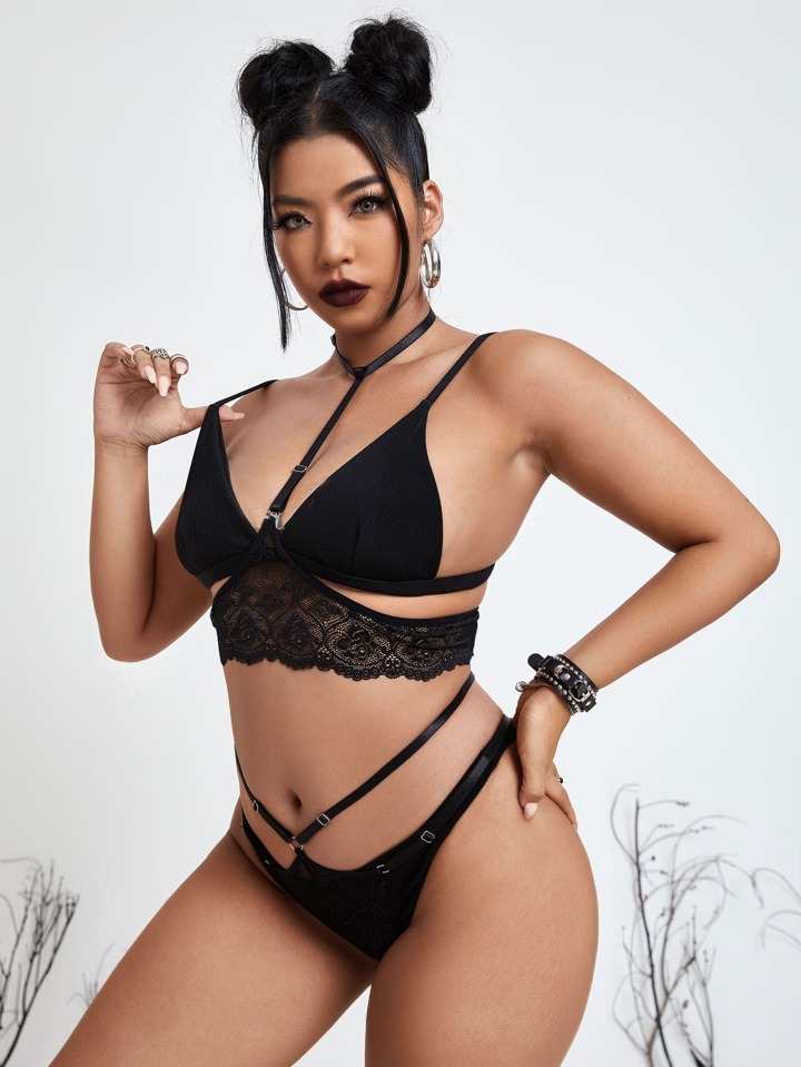 Plus Cut Out Choker Lingerie Set Without Bra & Panty
