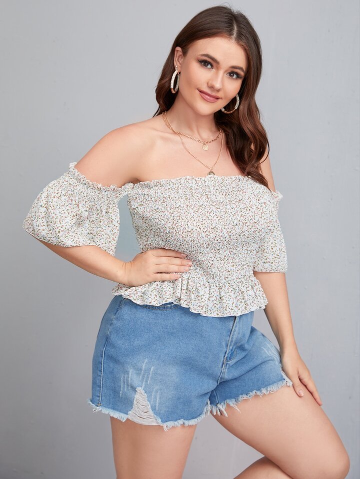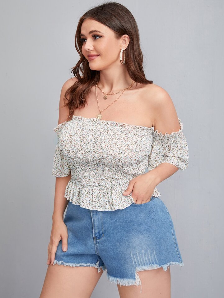 Plus Ditsy Floral Off The Shoulder Ruffle Trim Shirred Top
