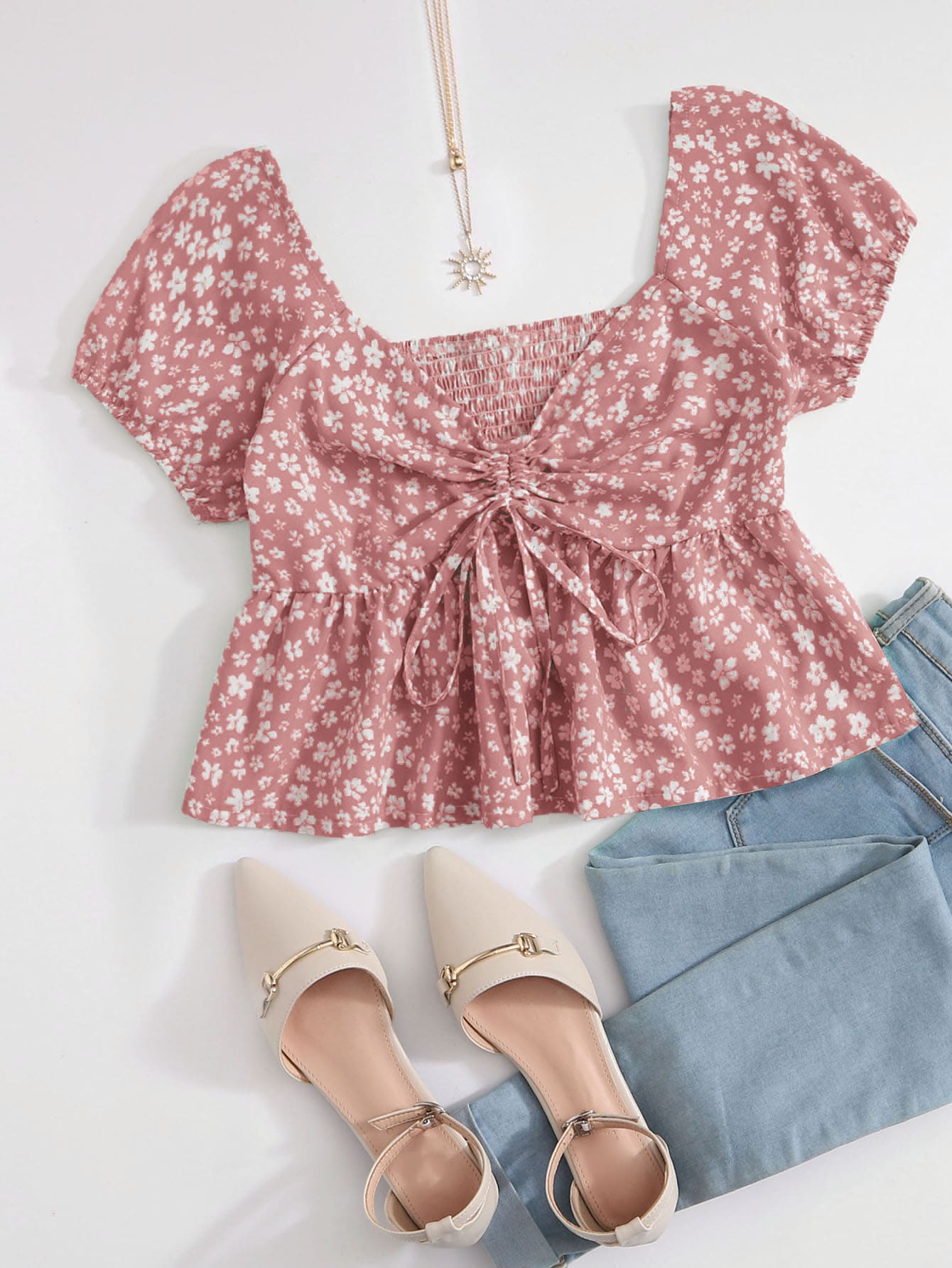 Plus Ditsy Floral Shirred Back Drawstring Front Blouse