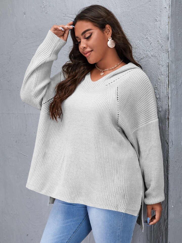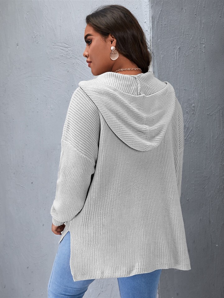 Plus Drop Shoulder High Low Hooded Sweater