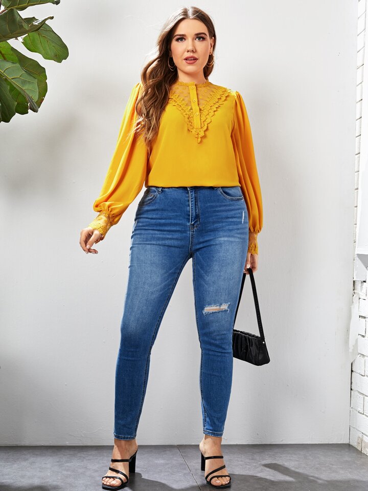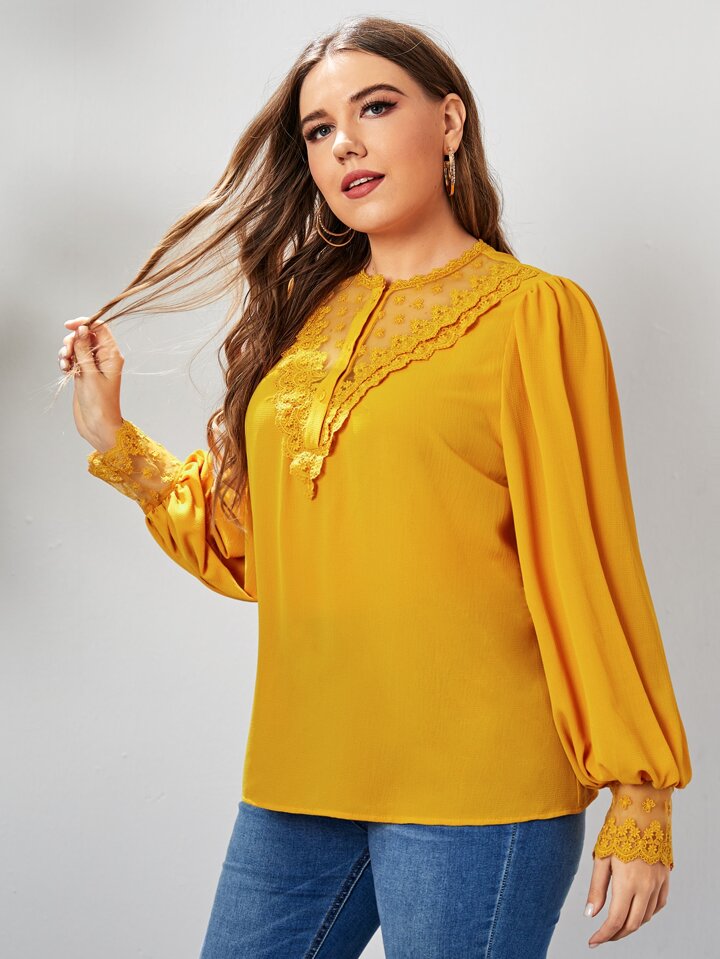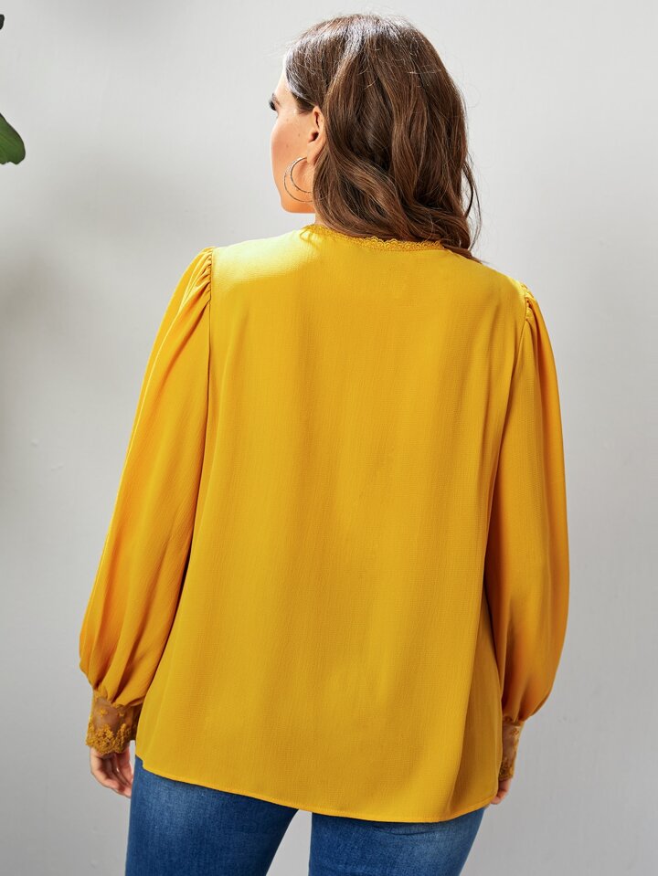 Plus Embroidered Mesh Trim Lantern Sleeve Top