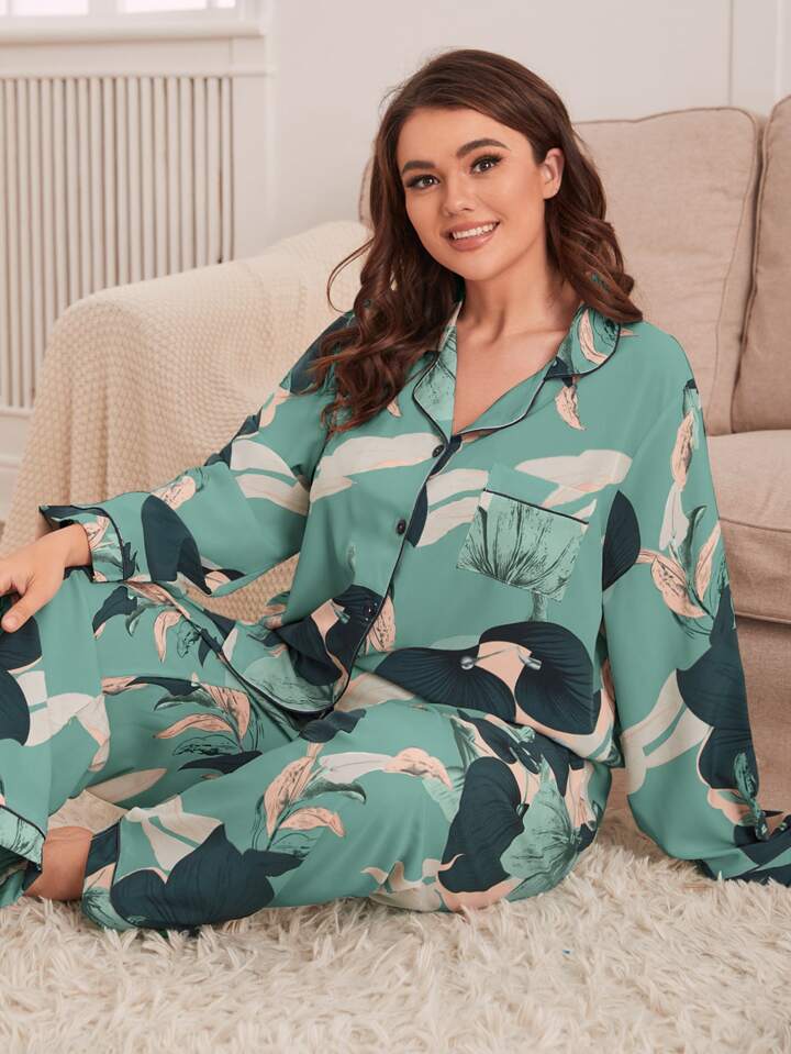 Plus Floral Print Contrast Piping Blouse & Pants PJ Set
