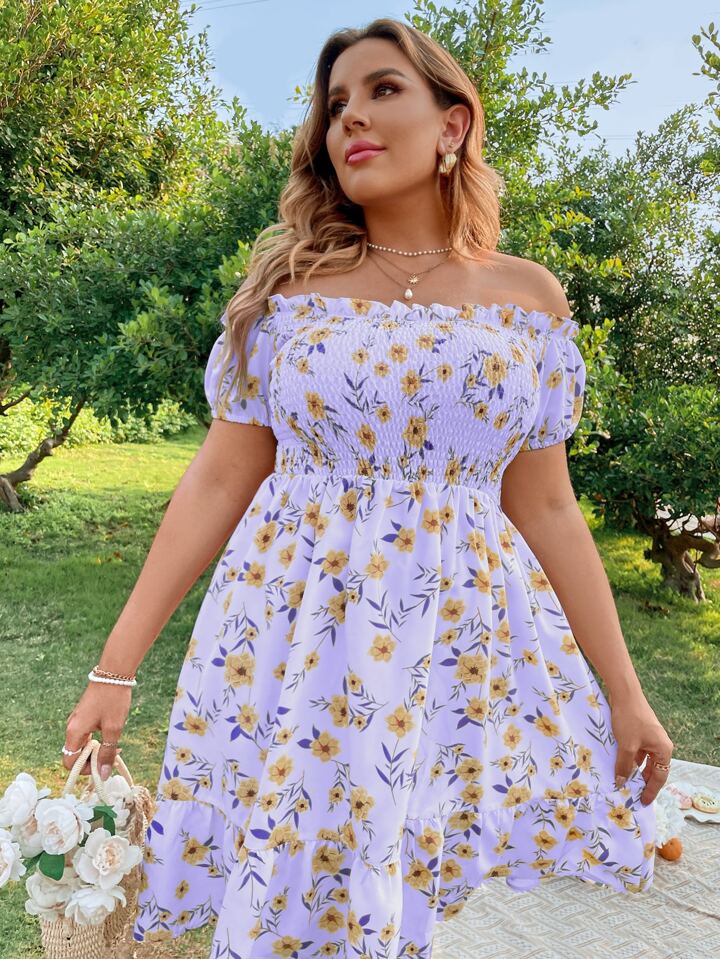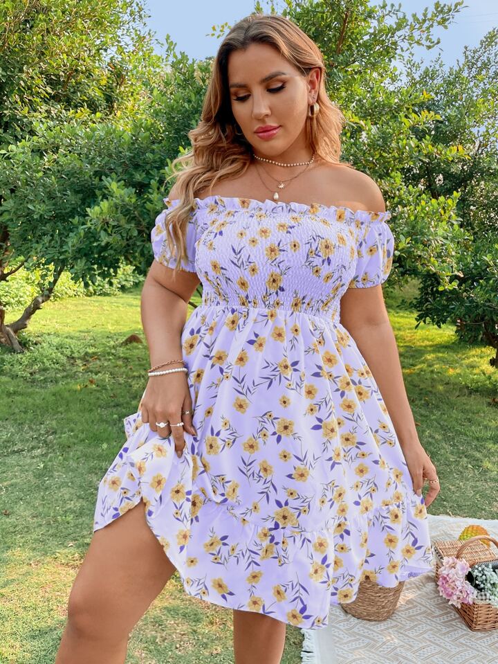 Plus Floral Print Off Shoulder Shirred Ruffle Hem Dress