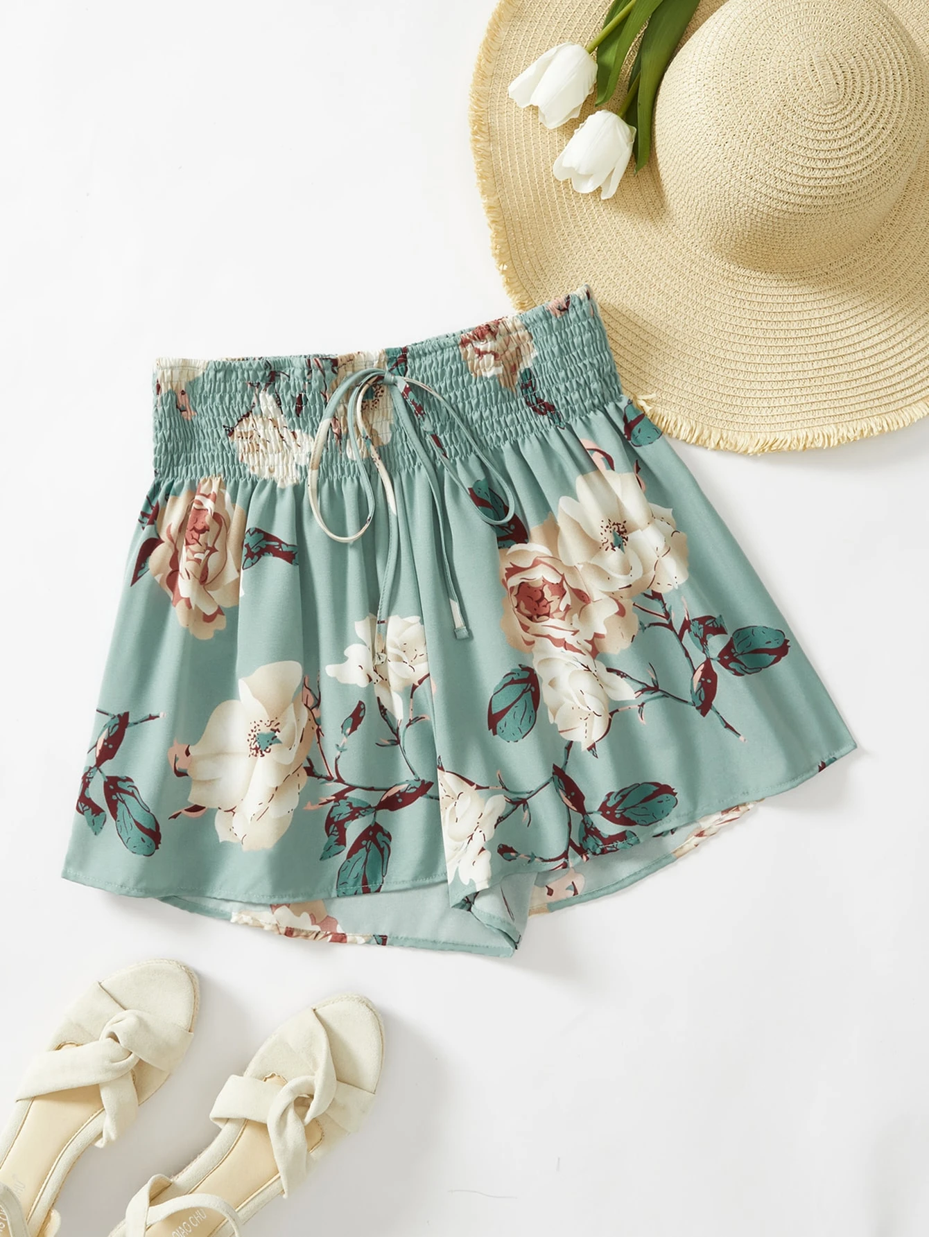 Plus Floral Print Shirred Waist Knot Front Shorts