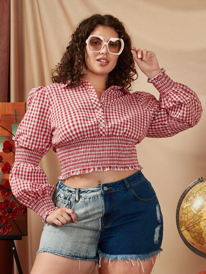 Plus Gingham Print Half Button Shirred Frill Trim Blouse