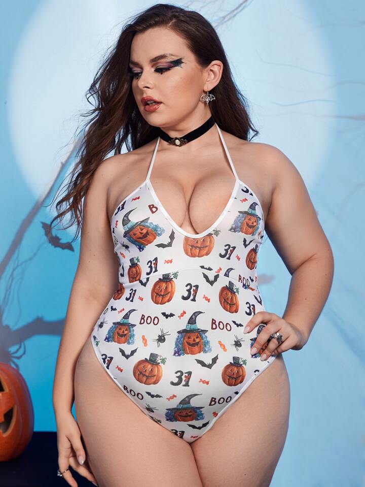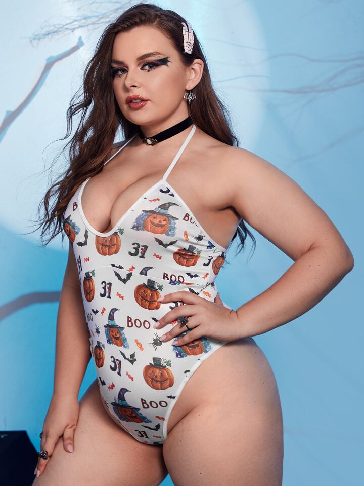 Plus Halloween Pumpkin Print Teddy Bodysuit