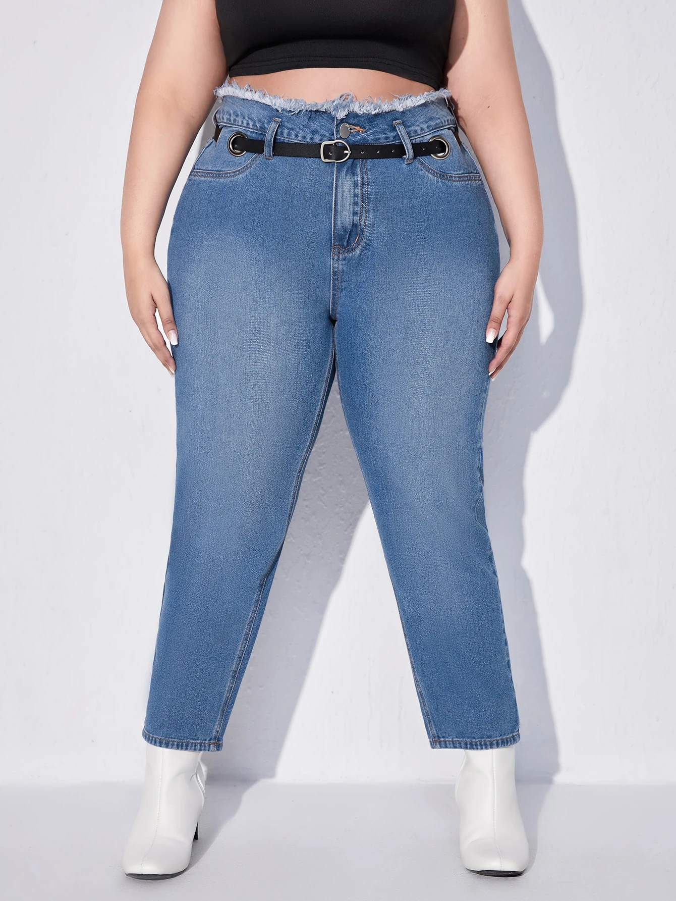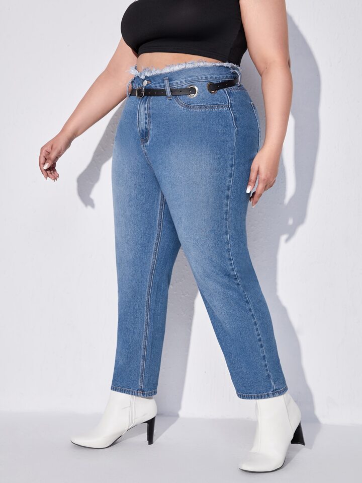 Plus High Waist Bleach Wash Frayed Trim Belted Mom Jeans