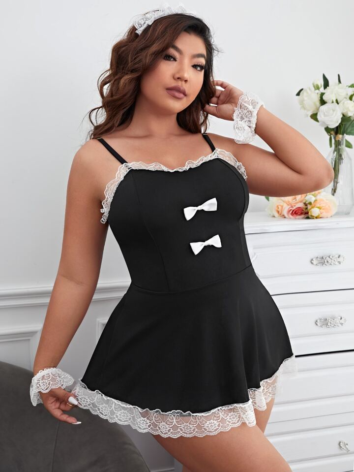 Plus Lace Trim Bow Front Maid Costume Dress & 1pair Wristbands