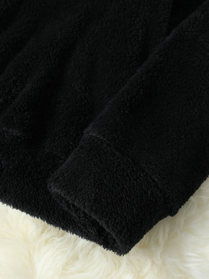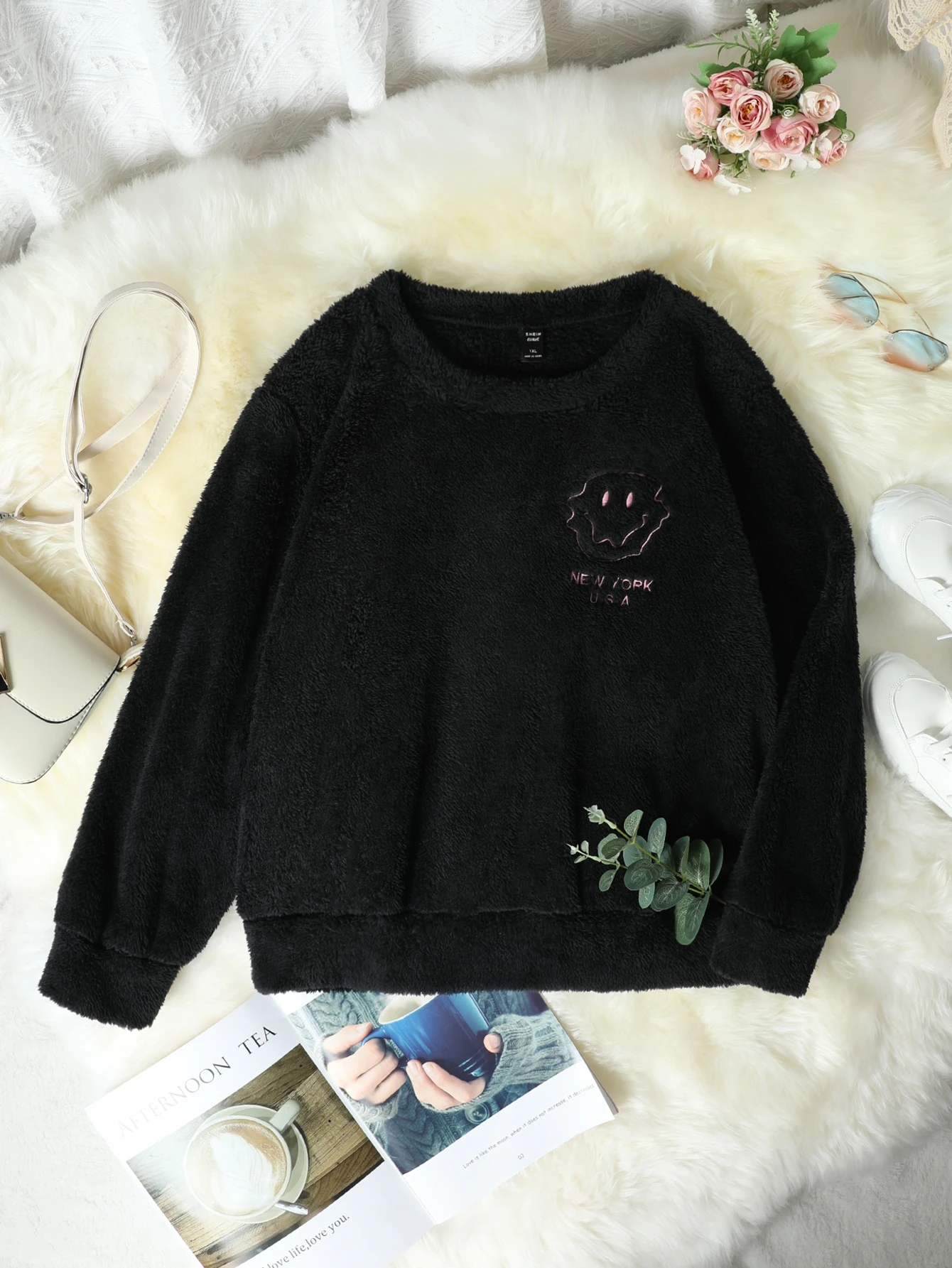 Plus Letter And Cartoon Face Embroidery Flannel Sweatshirt