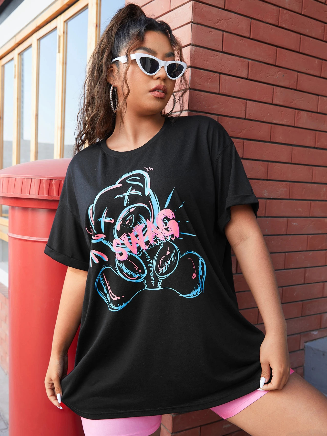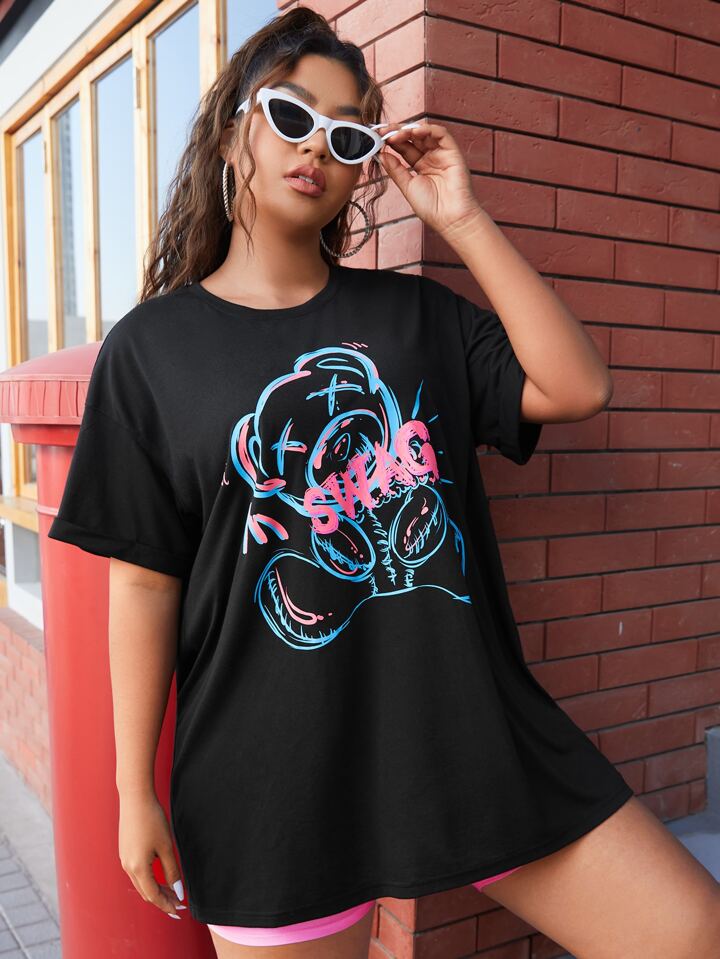 Plus Letter & Bear Print Drop Shoulder Top