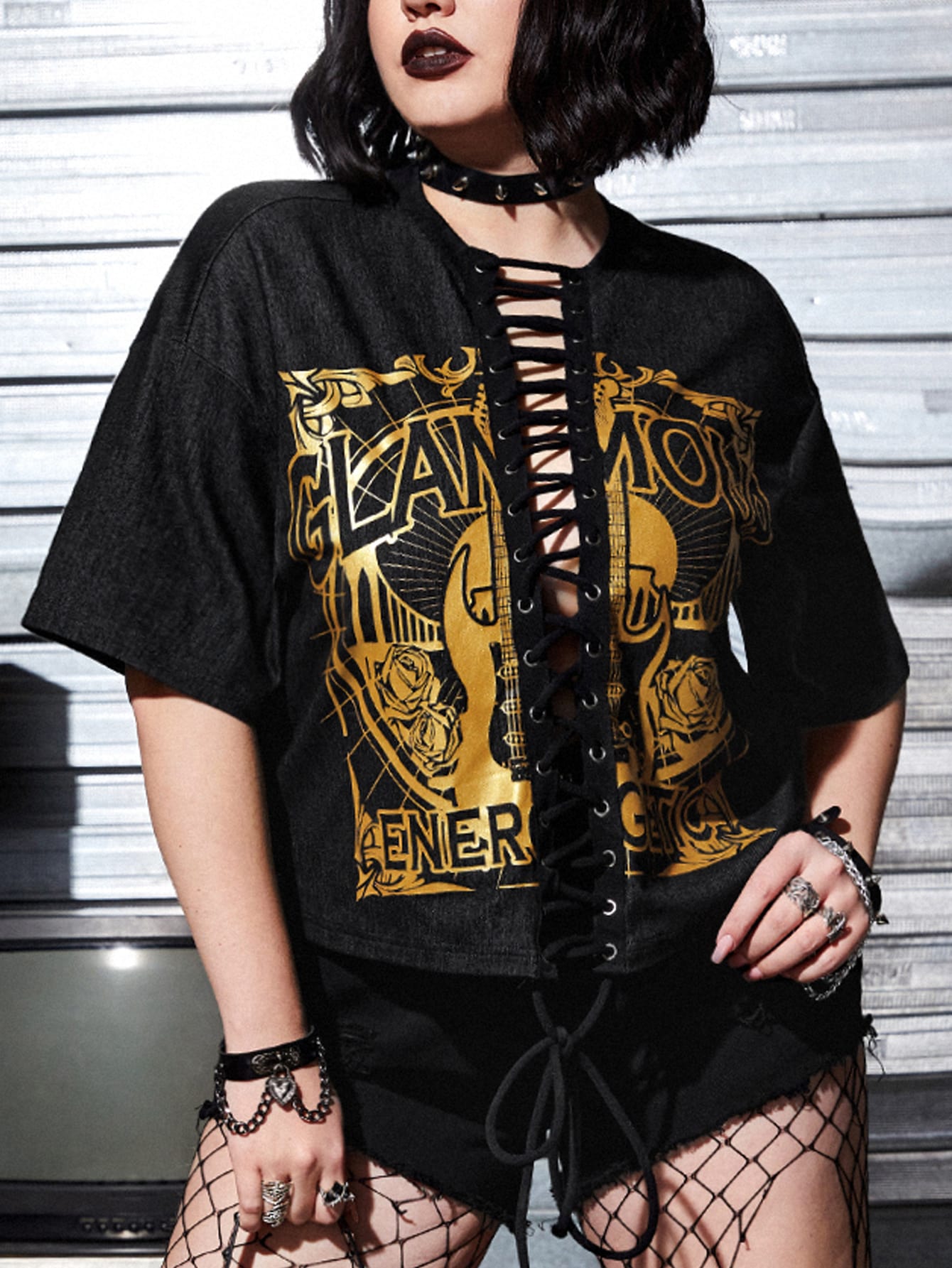 Plus Letter Graphic Lace Up Front Drop Shoulder Tee