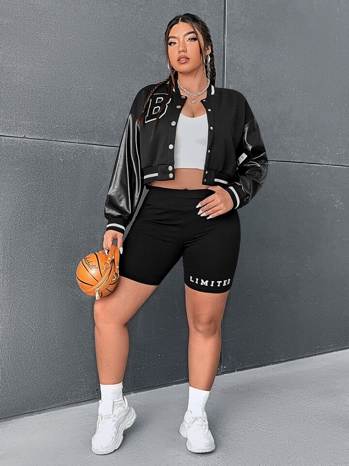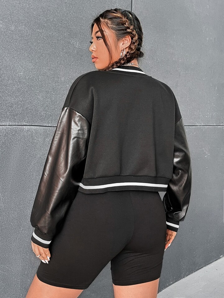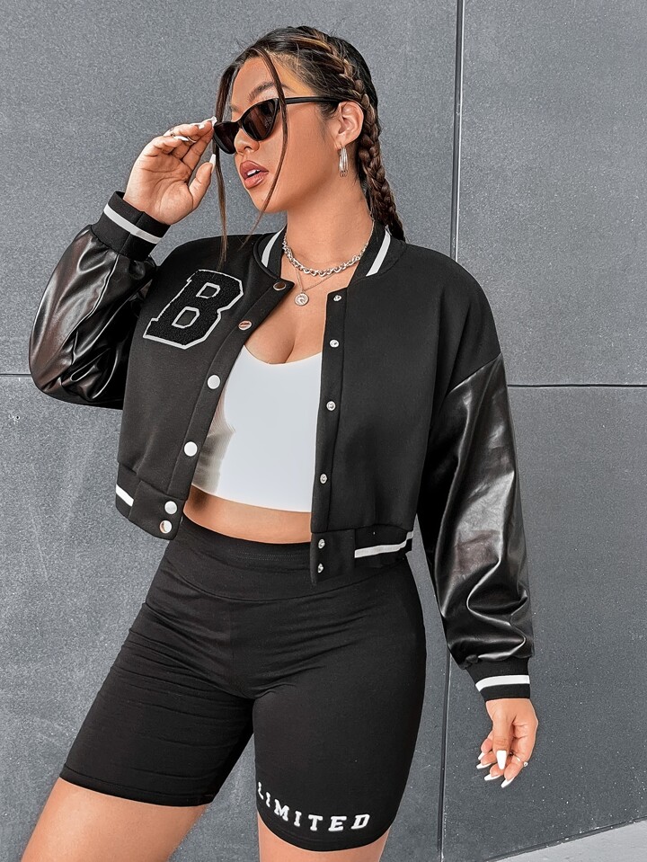 Plus Letter Patched Striped Trim Drop Shoulder Crop Bomber Jacket Winter Fall Autumn