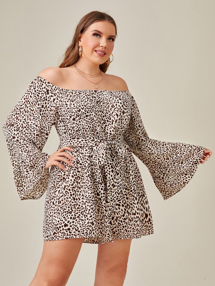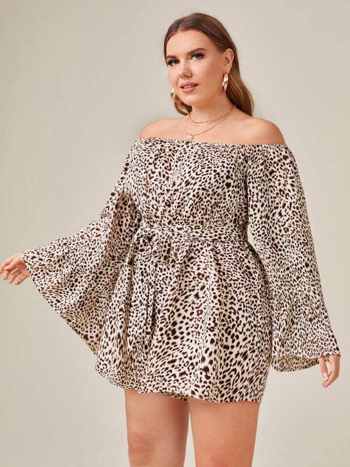 Plus Off Shoulder Bell Sleeve Belted Leopard Romper