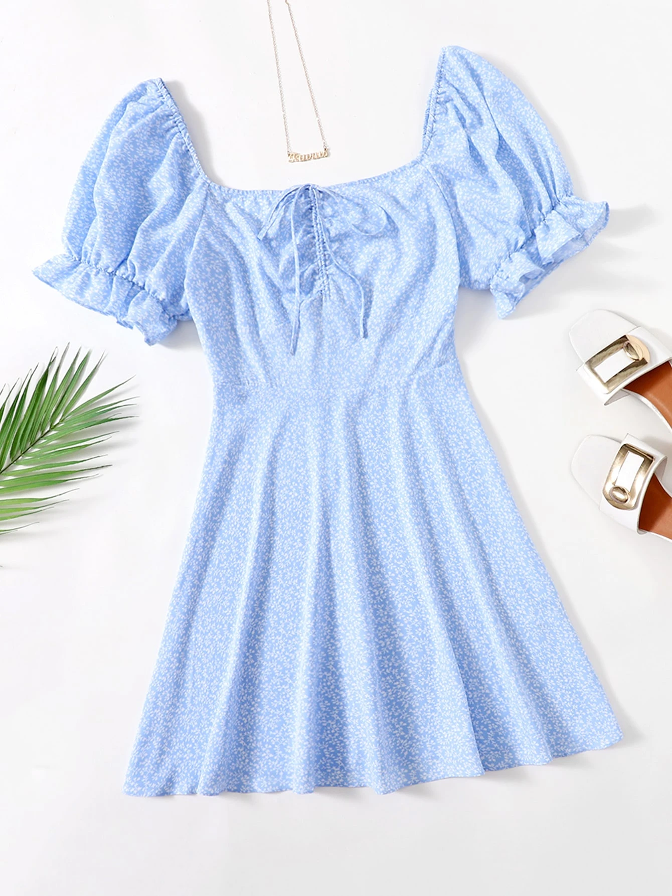 Plus Puff Sleeve Drawstring Allover Print Milkmaid Dress