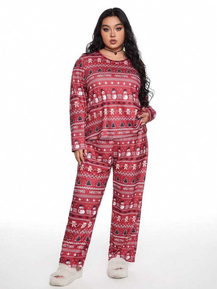 Plus Size Christmas Snowman & Gingerbread Man Snowflake Print Warm Comfortable Casual Long Sleeve Sleepwear Set For Winter