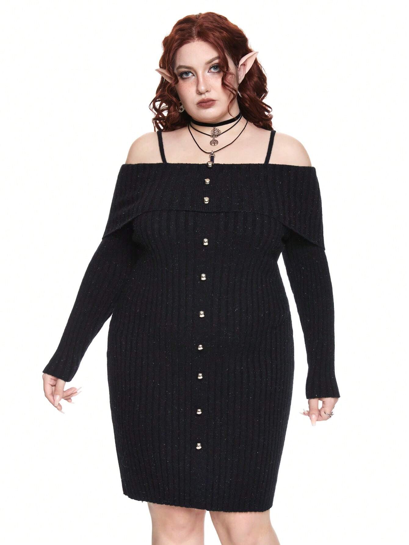 Plus Size Glamorous Metal Button Off Shoulder Gold Thread Sweater Dress