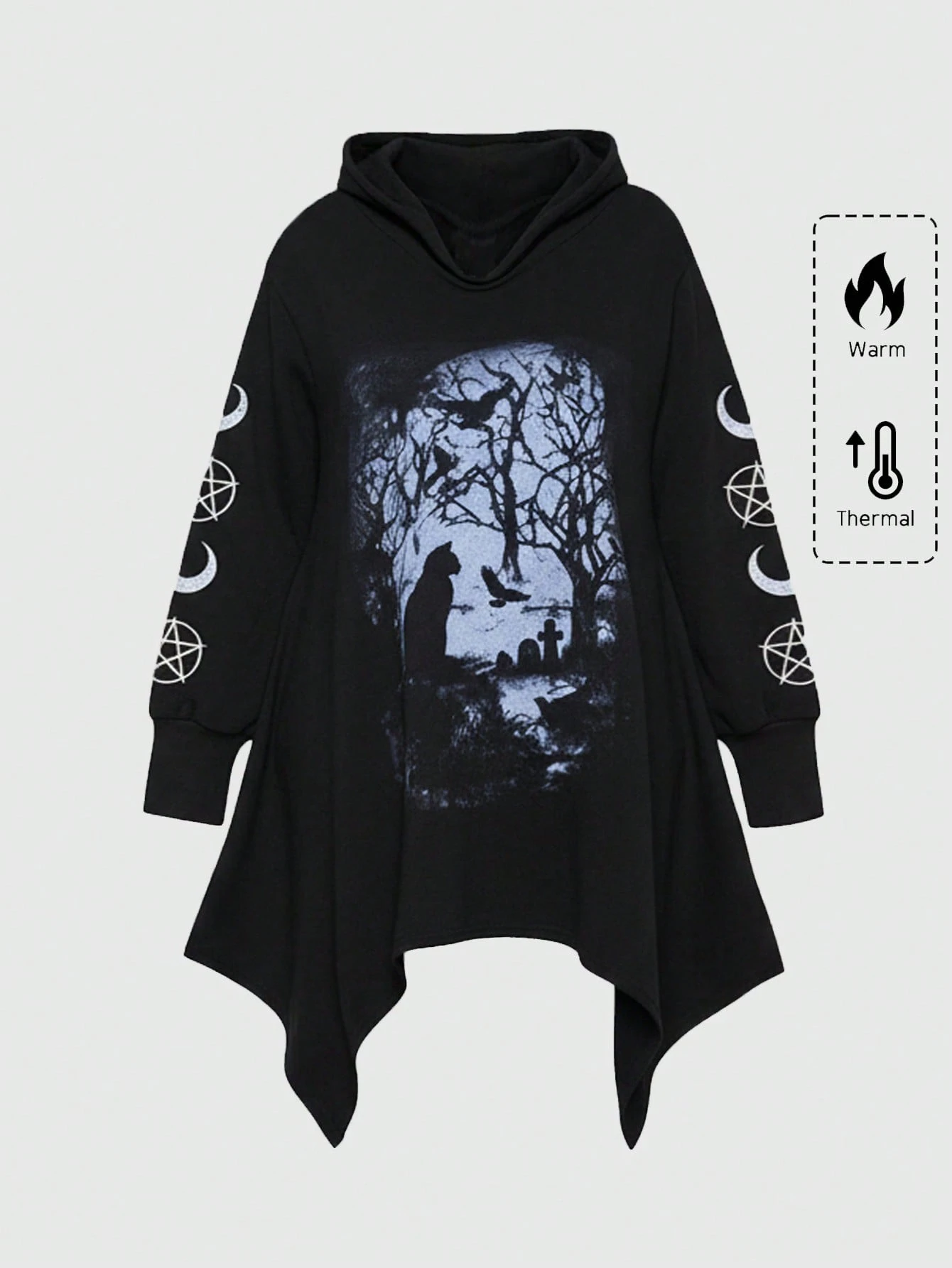 Plus Size Gothic Bat, Forest, Star & Moon Pattern Asymmetric Hem Hooded Black Sweatshirt, Casual Plus Size Women Sweatshirt For Autumn/Winter, Daily Wear Plus Size Women Clothing, Gothic Style Plus Size Women Outerwear Sweatshirt