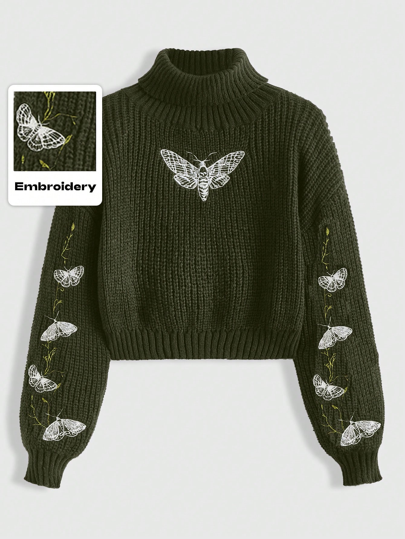 Plus Size Gothic Moth & Butterfly Vine Embroidery Olive Green Pullover Sweater, Autumn/Winter Women Plus Size Sweater