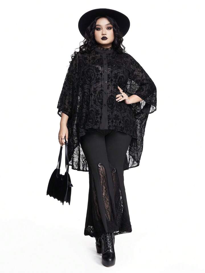 Plus Size Gothic Skeleton Cross Flocked Butterfly Sleeve Women Shirt