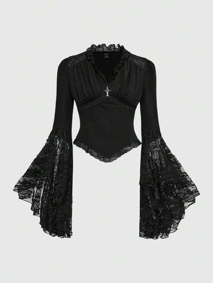 Plus Size Gothic Style Vintage Palace Ruffled Waist Fitted Lace Patchwork V-Neck Flare Sleeve Shirt