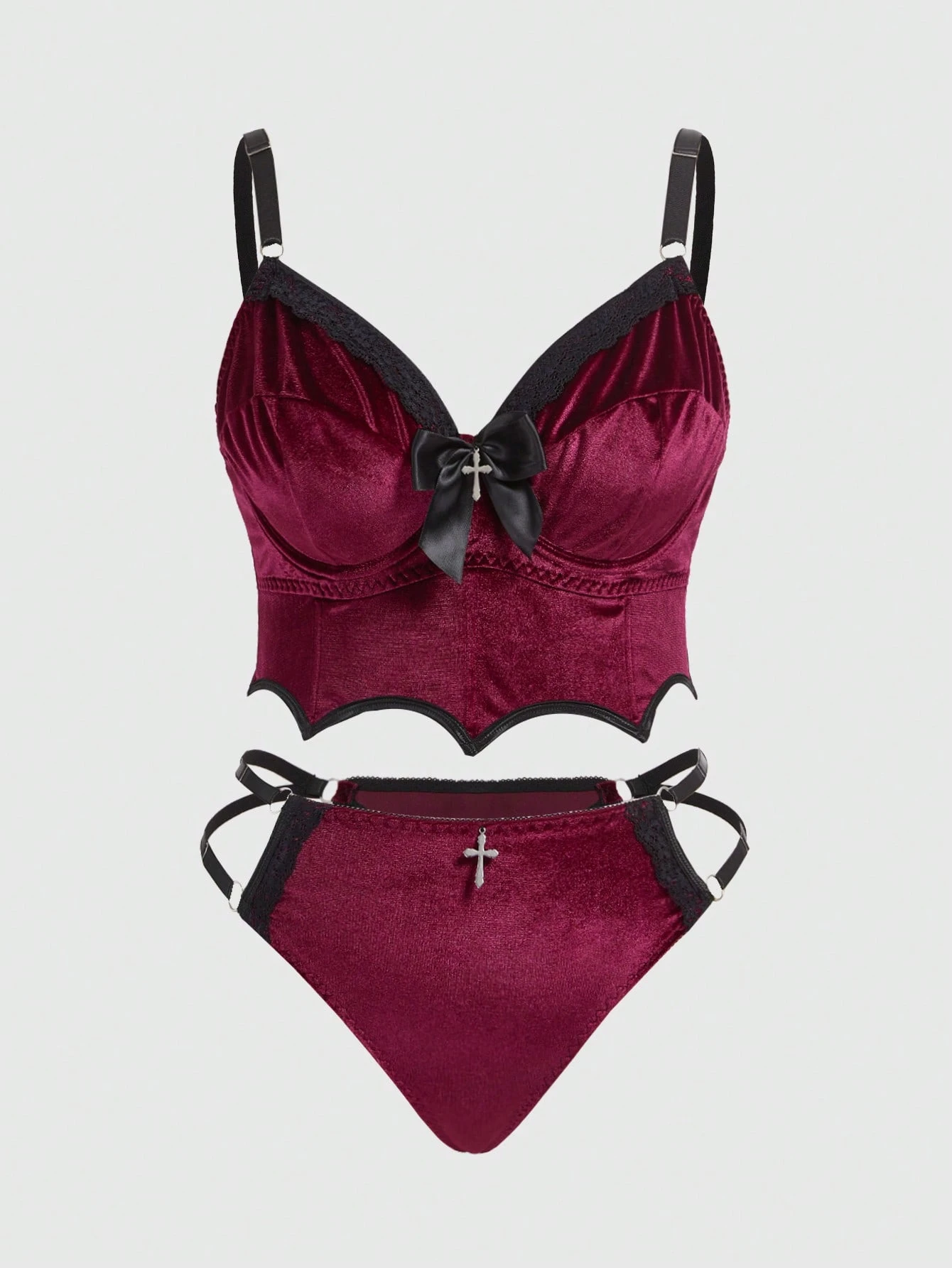 Plus Size Gothic Velvet Bat Wing Cross Pendant Underwire Bra And Thong Lingerie Set