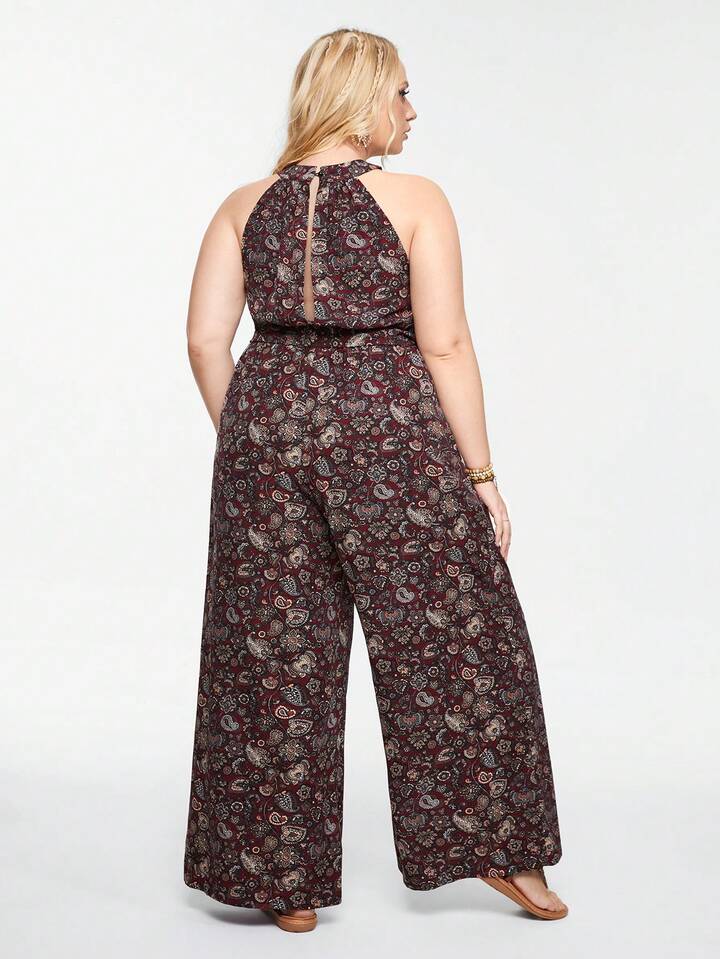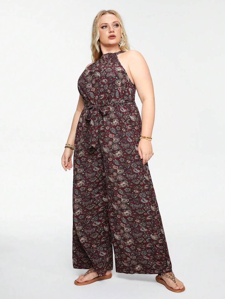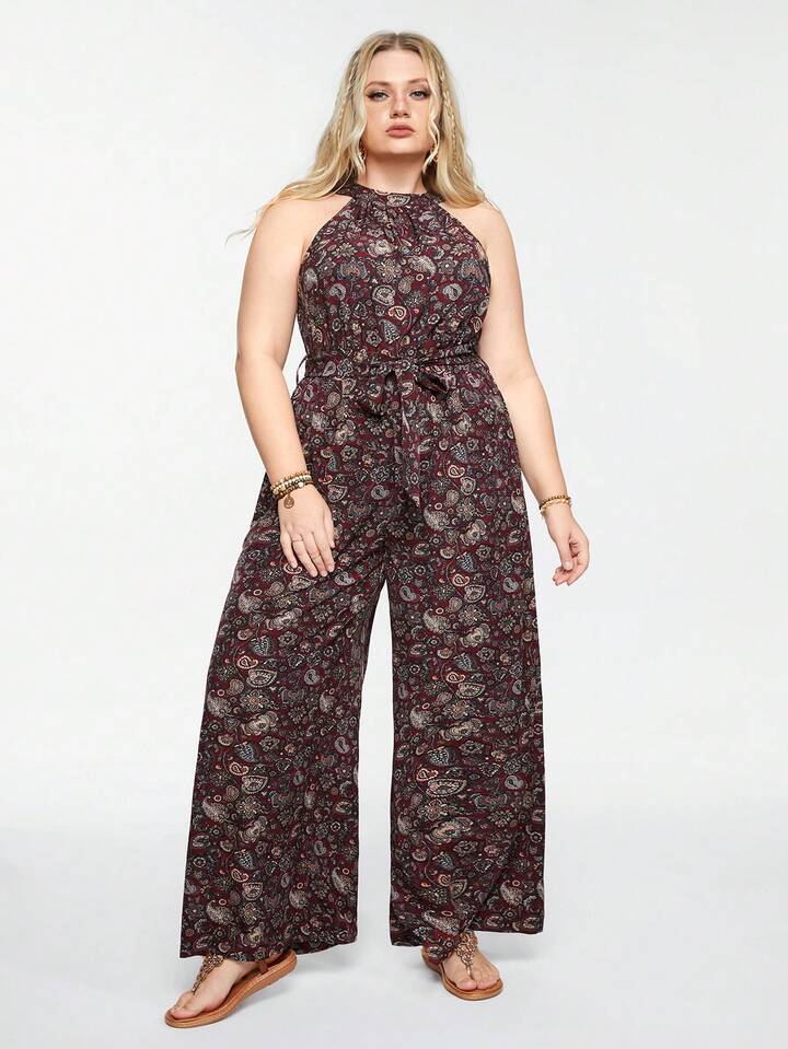 Plus Size Hippie Paisley Print Tie Waist Jumpsuit