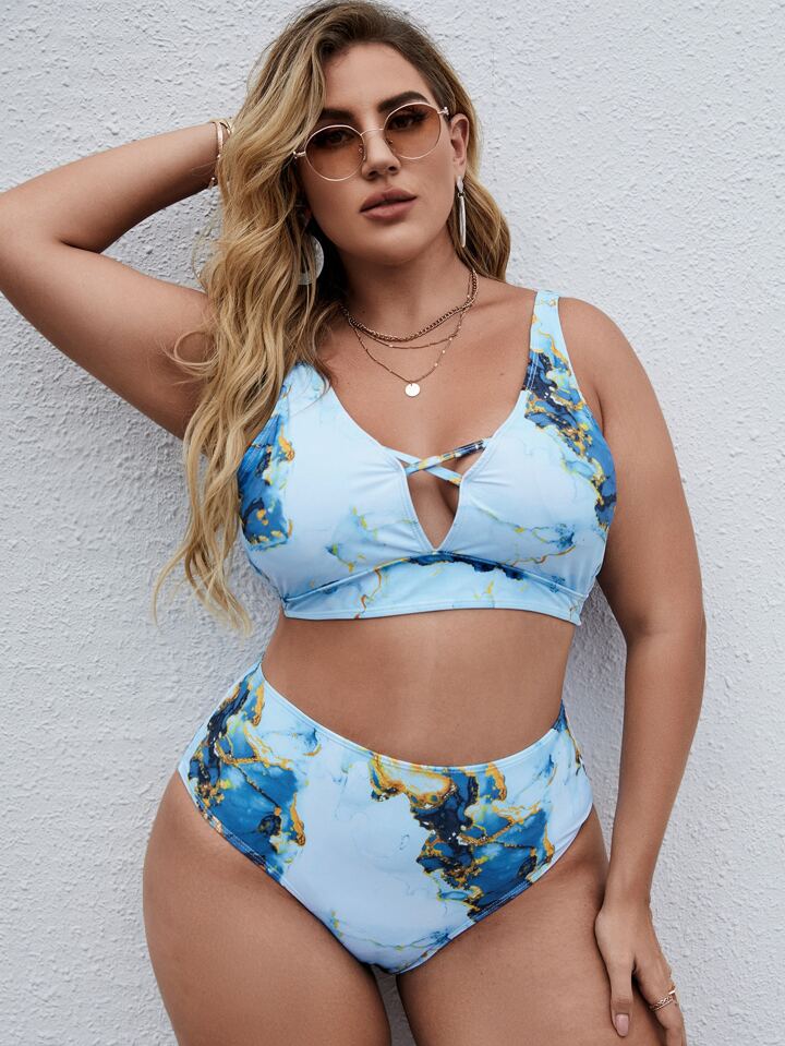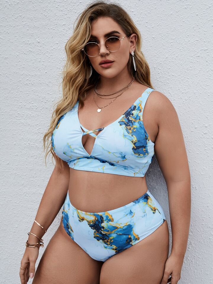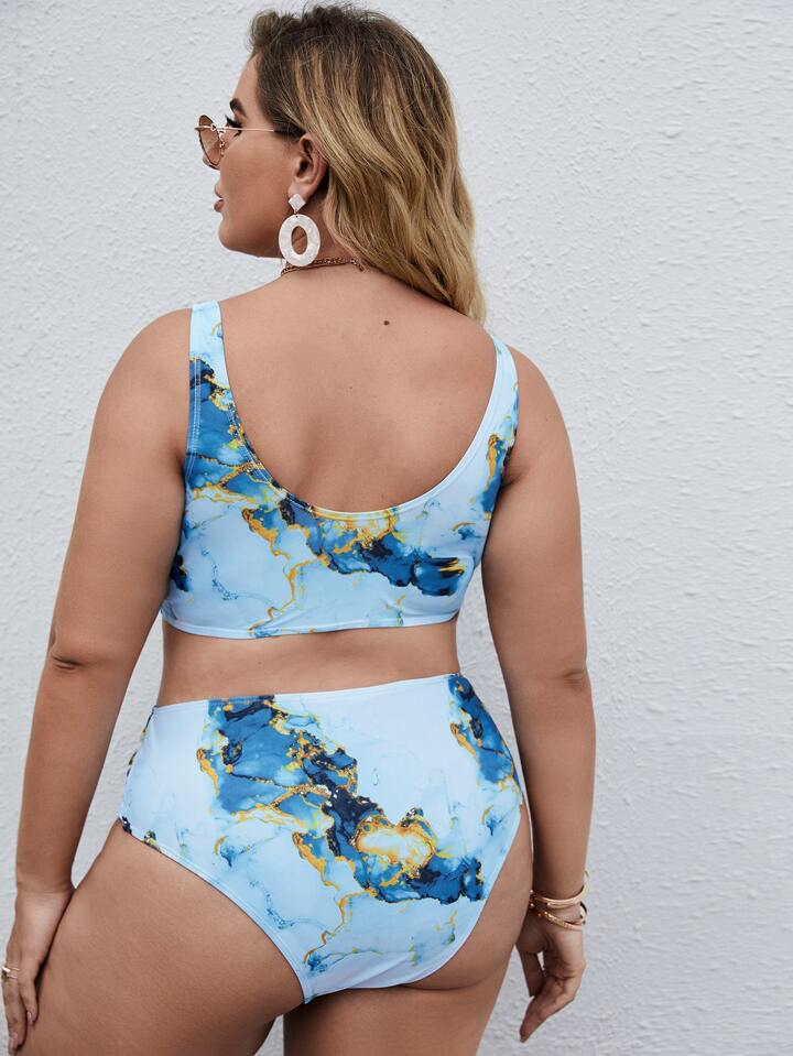 Plus Size Marble Print High Waisted Bikini Set Summer Beach