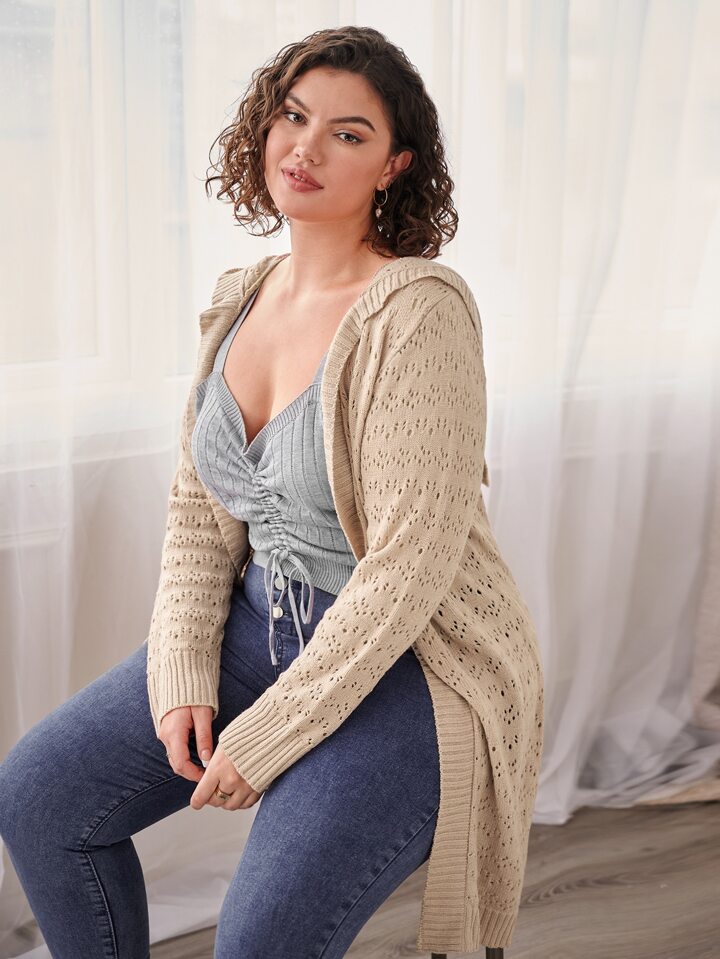 Plus Size Pointelle Knit Hooded Cardigan